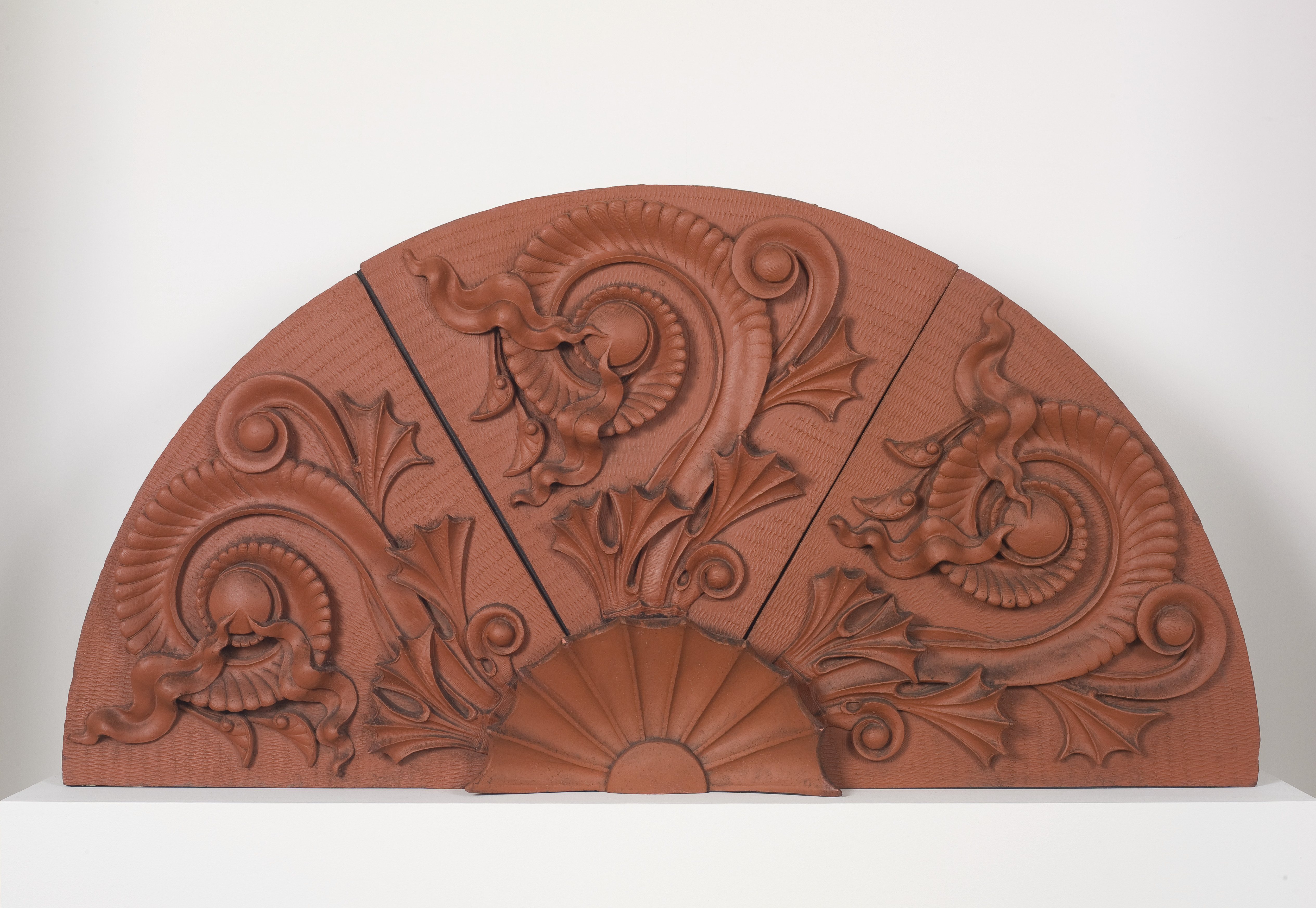 The scrolling motifs and sprouting leaves on this lunette suggest natural forms that have been simplified and abstracted. The high relief of these designs is quite different from Louis Sullivan’s later concept of ornament as low-relief motifs that merge and mingle with the surface. This ornament is reminiscent of designs by the English architect Owen Jones and the Philadelphia architect Frank Furness, with whom Sullivan worked briefly in 1873. This arched lunette decorated the top story windows of the Scoville Building, a Chicago factory designed by Sullivan and his partner, Dankmar Adler.