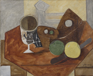 In this arrangement of circular and triangular shapes, Georges Braque represents a green apple and yellow apple resting on a knife, a carafe and goblet, and a basket of eggs. These objects sit on a russet table cloth, which is tilted up so that the viewer gets both a horizontal and bird’s eye view. Braque depicts the table and background with thinned paint, in contrast to his objects that are rendered in paint thickened by the addition of sand.