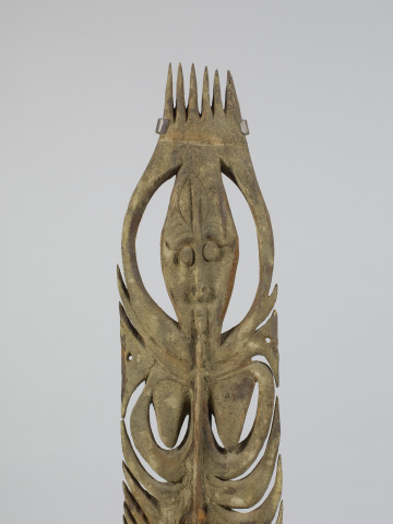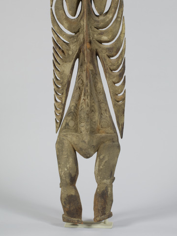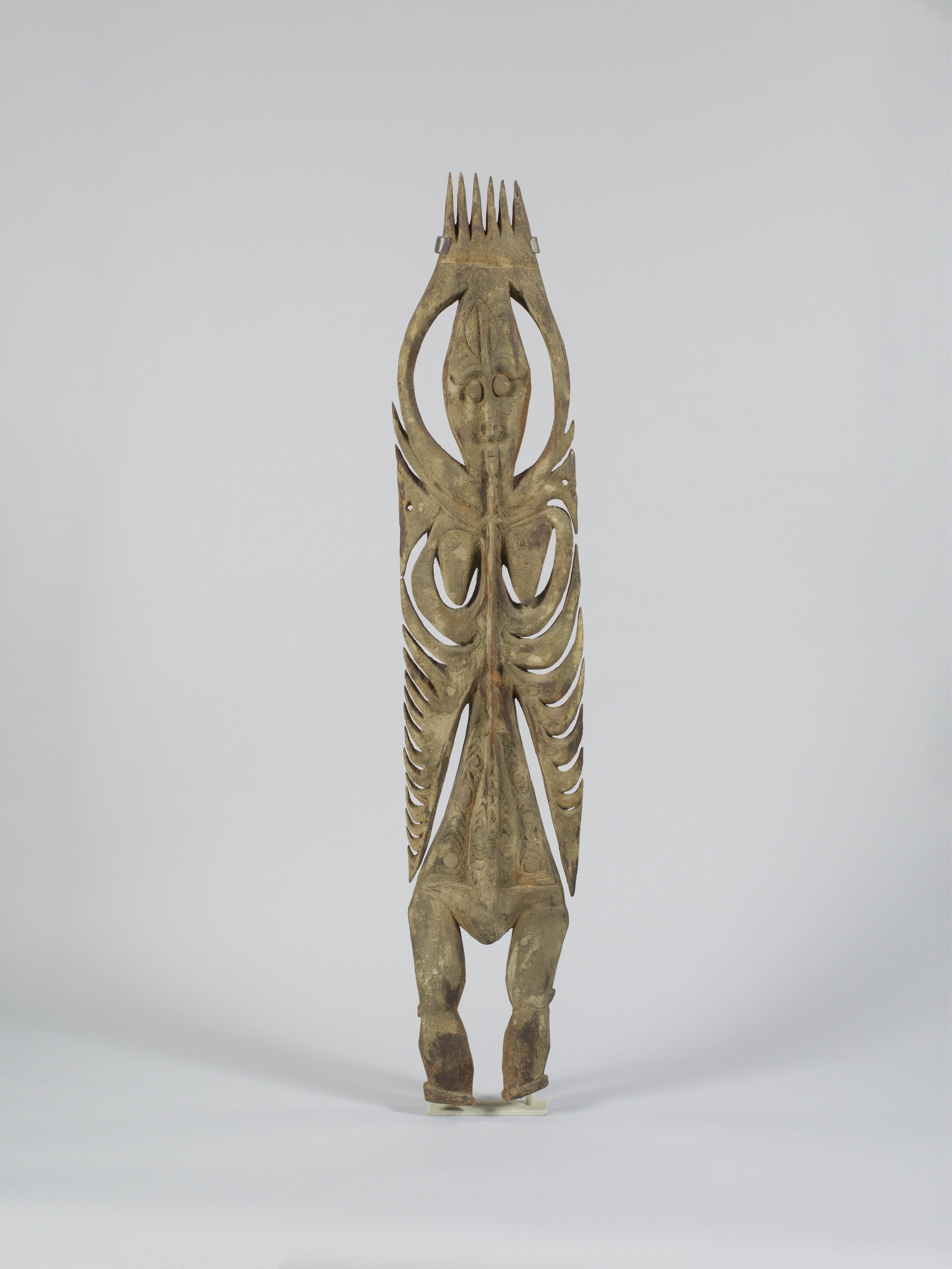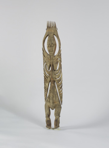 This figure’s frontal form makes evident her most symbolic features. The halo-like shape around her head represents a hood-like cap made of bark cloth, which was traditionally worn by women in the Korewori River region of the Sepik River. Pendulous breasts suggest an elderly woman while incised motifs on her trunk indicate the navel and intestines, and lateral hooks represent ribs. This work was created through a collaborative process originating with a hunter, who envisioned the form in a dream, and a sculptor, who was commissioned to transcribe this vision in wood. Female figures such as this are considered guardians of game and the hunt. As “mothers” of Ewa men’s ceremonial houses, the figures play an important role in rituals conducted there before hunting expeditions.