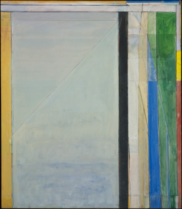 This painting is composed of a central blue-gray section, balanced by jewel-toned bands of color. Richard Diebenkorn created this work by applying and wiping away layers of paint. This painting comes from the artist’s most significant series, Ocean Park, which he began in 1967 and continued over the next two decades. The series was inspired by the Ocean Park neighborhood of Santa Monica, the location of Diebenkorn’s studio. While eliminating figurative subject matter, Diebenkorn retained allusions to the landscape, using translucent and opaque planes of color to evoke the light and atmosphere of California.