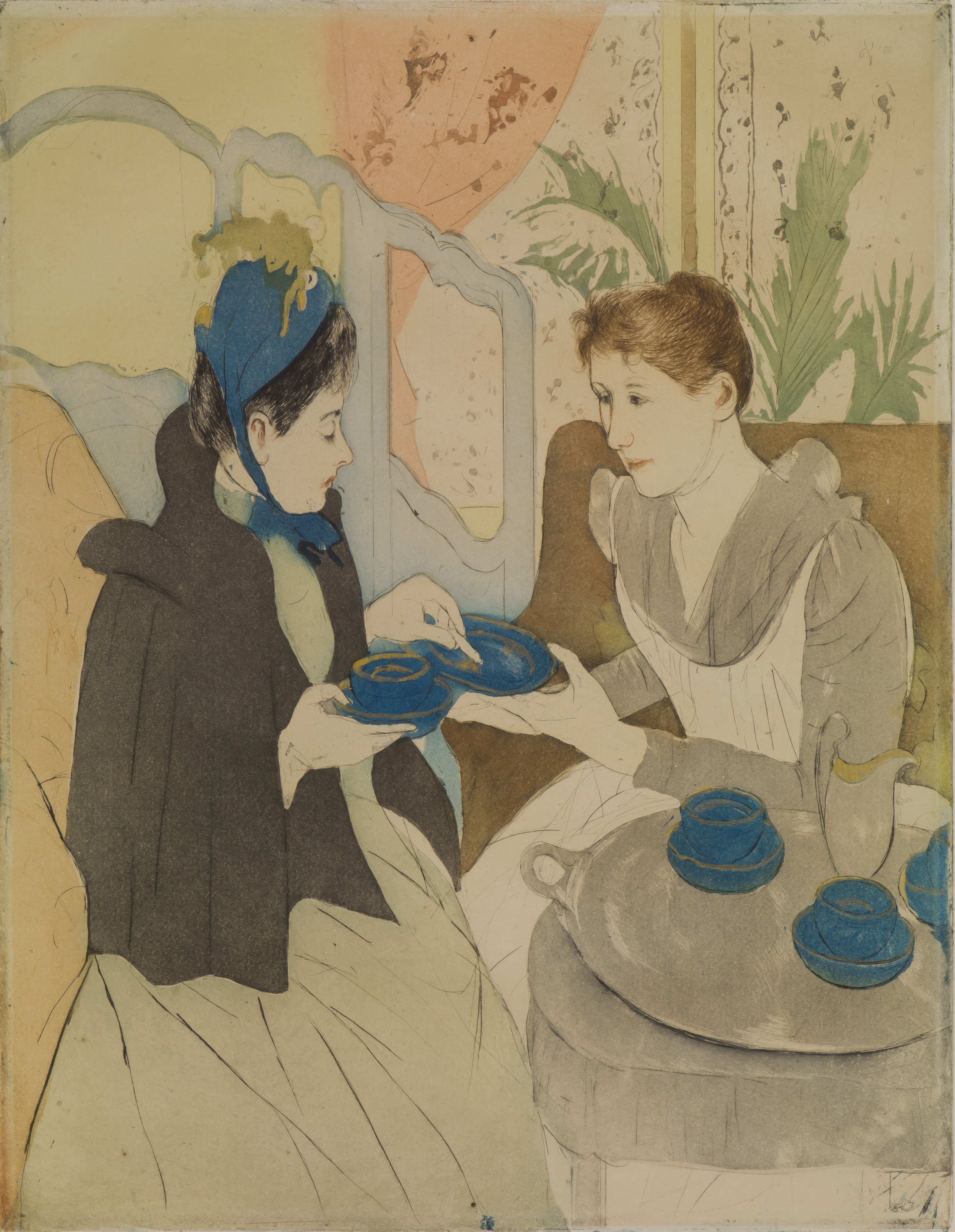 This print invites viewers into a charming domestic interior, with a woman offering her visitor tea. Mary Cassatt was inspired by Japanese woodblock prints for their delicate washes of color and compressed space. After seeing an exhibition of Japanese prints in 1890, she wrote to Berthe Morisot, “Seriously, you must not miss that . . . I dream of it and don’t think of anything else but color on copper.” Soon after, she made a series of color prints, seeking to emulate the Japanese style on an etching plate.