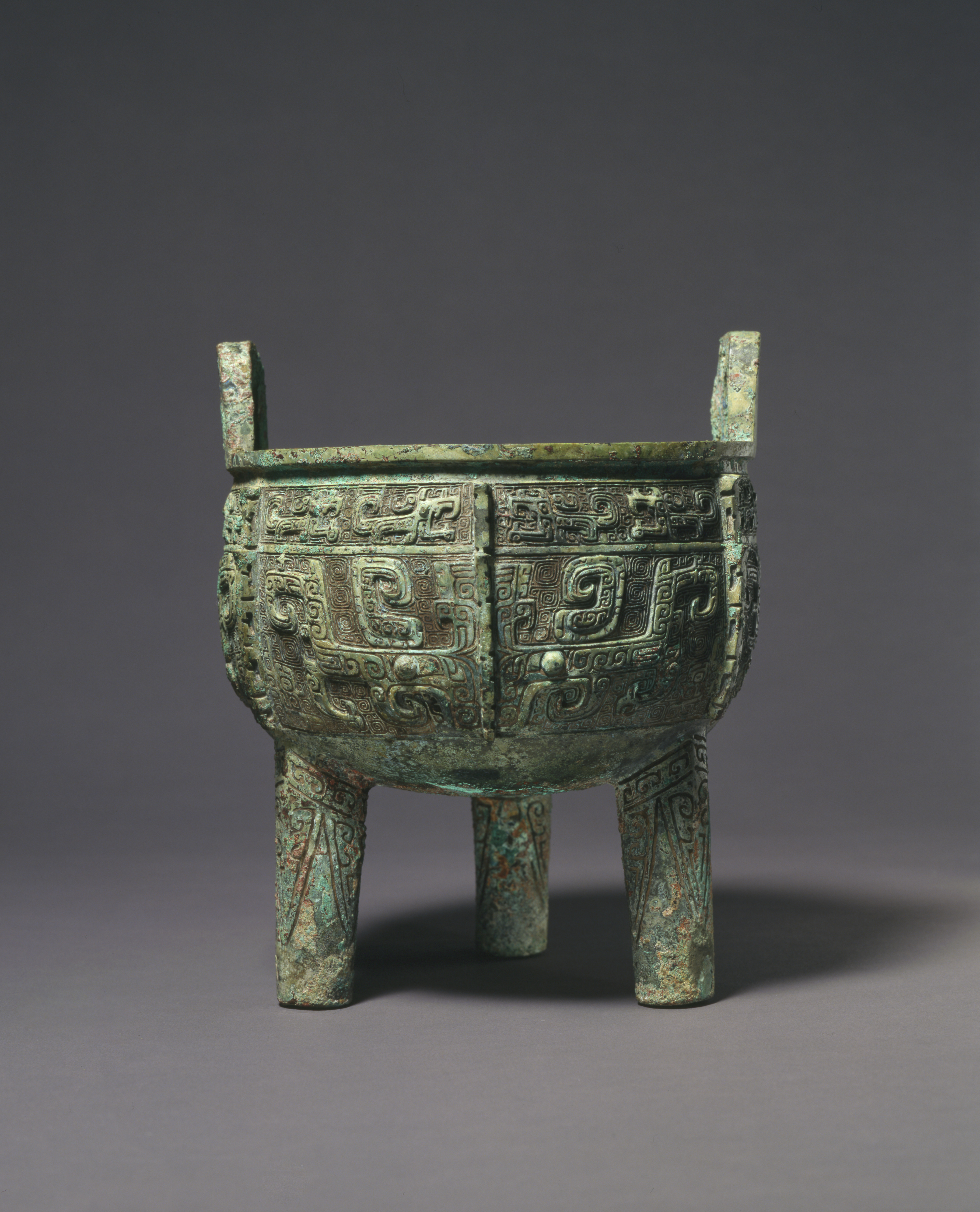 The main sections are cast in relief with zoomorphic masks (taotie) and dragons against a background of spiral patterns (leiwen), while the cylindrical legs have a decoration of triangular patterns. An inscription, which may be read as one or two characters, is cast onto the interior wall of the vessel on one side below the mouth rim.