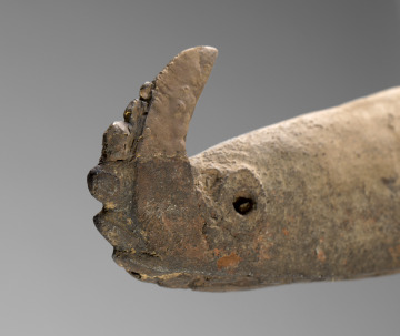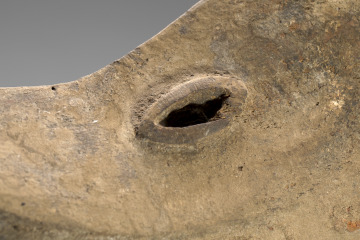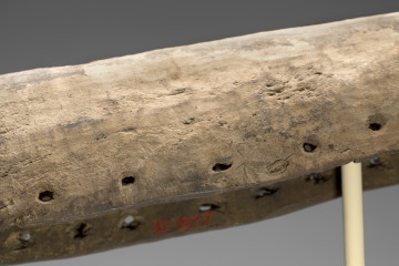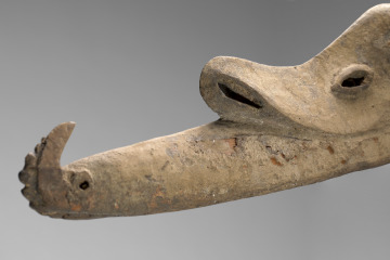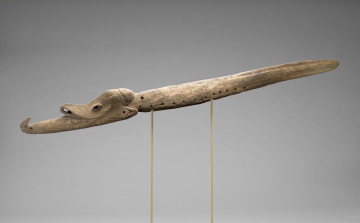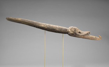 The simple, elongated shape of this mask evokes the body of a fish or crocodile. However, a human face appears at one end. This duality of animal and human elements is essential in the Iatmul worldview. It suggests the ability of ancestors to transform and appear in many manifestations. Young Iatmul men wore masks such as this, horizontally atop their heads, during the first stage of initiation. The pierced holes along the bottom served to affix a covering of plant fibers that hid the body of the dancer.