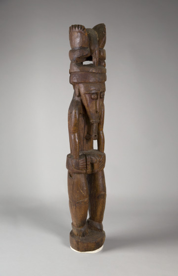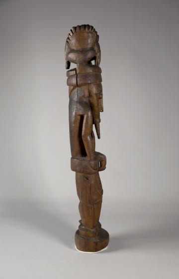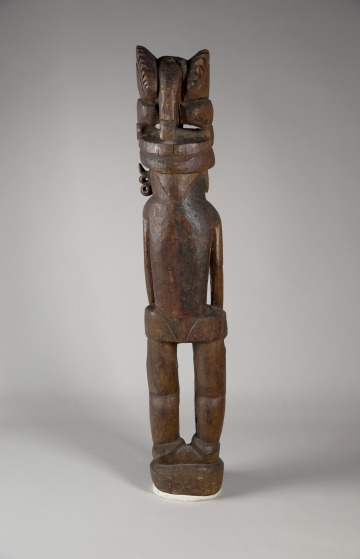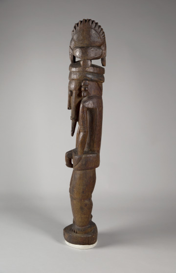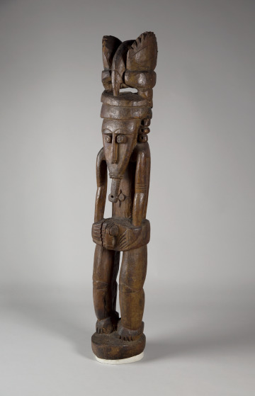 A bird, possibly a hornbill, sits atop this figure’s head. The bird likely indicates the clan to which the important individual represented belonged. In New Guinea, each animal or plant species is linked to a precise clan or familial group by descent. Beneath the figure’s chin, a component of body decoration conveys high social status among men from Astrolabe Bay. This sculpture would have appeared along with similar examples in the communal men’s house. There, young men would see the sculptures during their initiation to adulthood.