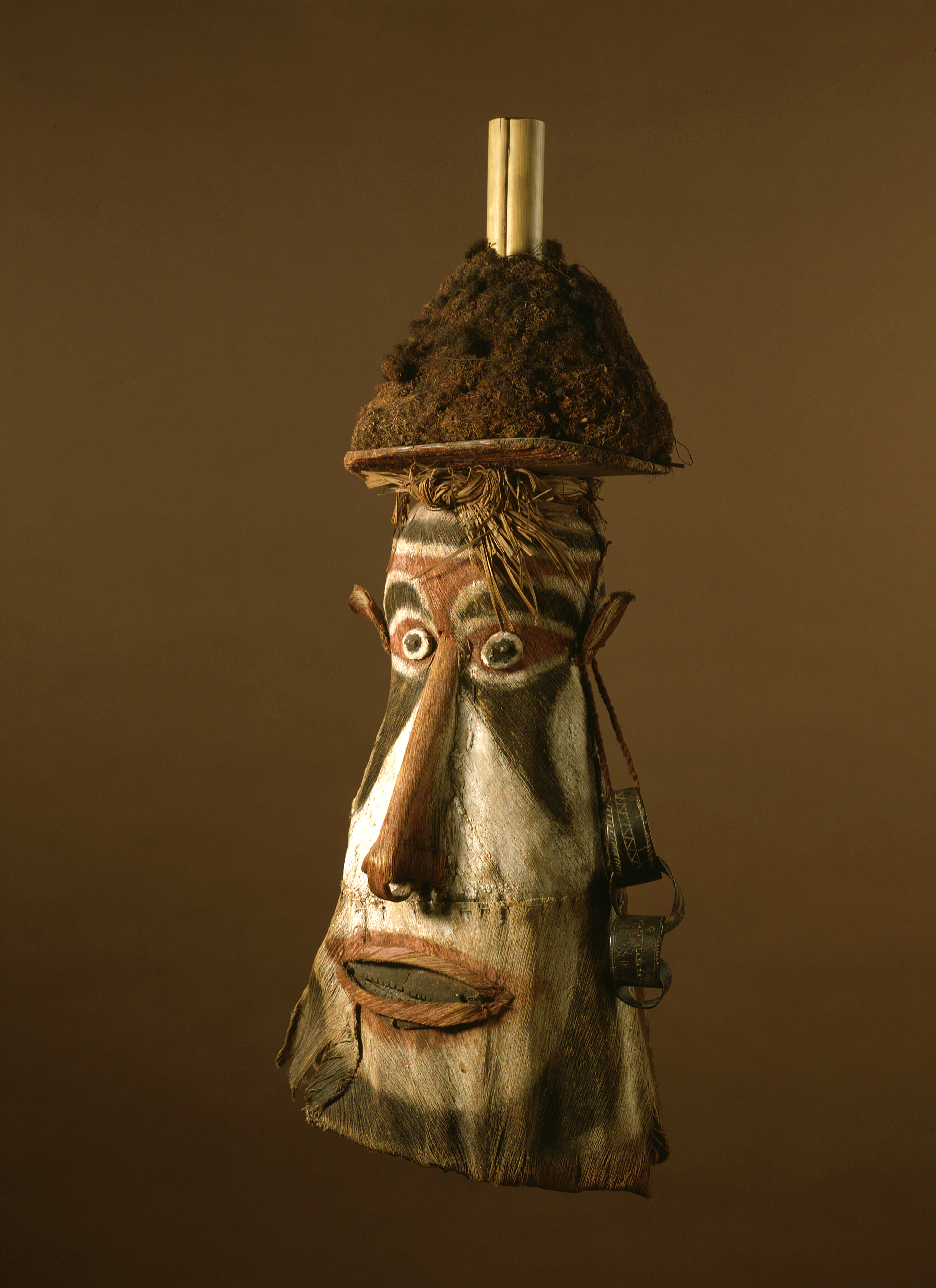 This mask originated with one of the groups of people living in the region between the Huon Peninsula on mainland New Guinea and the western part of New Britain, including the Siassi Islands in the Vitiaz Straits. It belongs to a group of masks, used only once every 10 years or so, that were said to represent a type of spirit or life force. Several masks were used at a time, with the wearers' bodies concealed within cloaks of leaves.