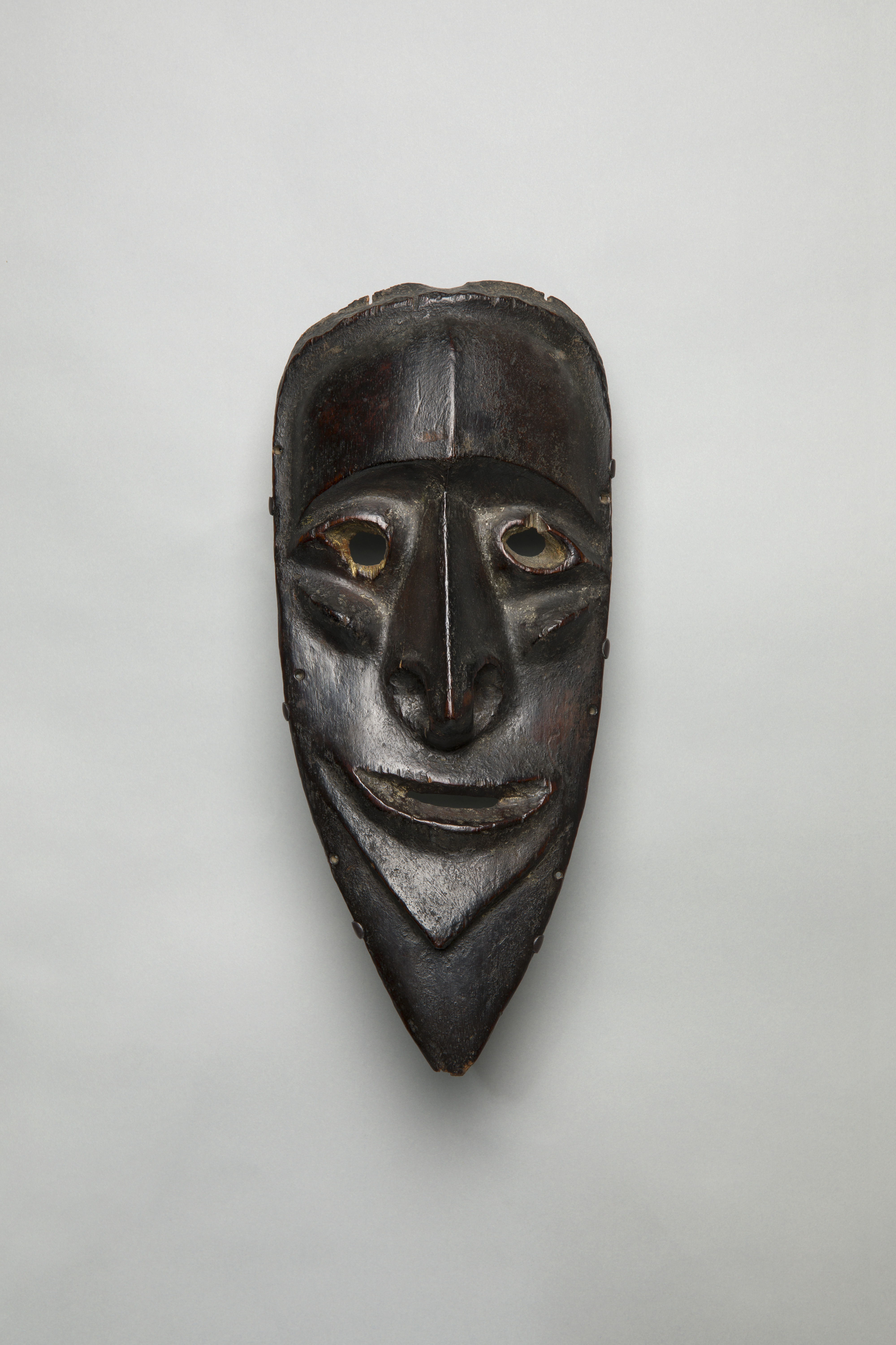 This mask, with its heavily patinated surface, is probably quite old. The holes drilled around the side of the face suggest that it was attached to some other object, probably a helmet-like structure that covered a dancer’s head. The lower part of the “double chin” would have been tucked inside the top of a costume, so that the dancer’s identity could be kept completely hidden from the audience. Such masks are reputed to carry a very strong and dangerous spiritual power from the past.