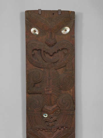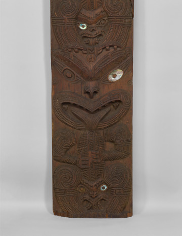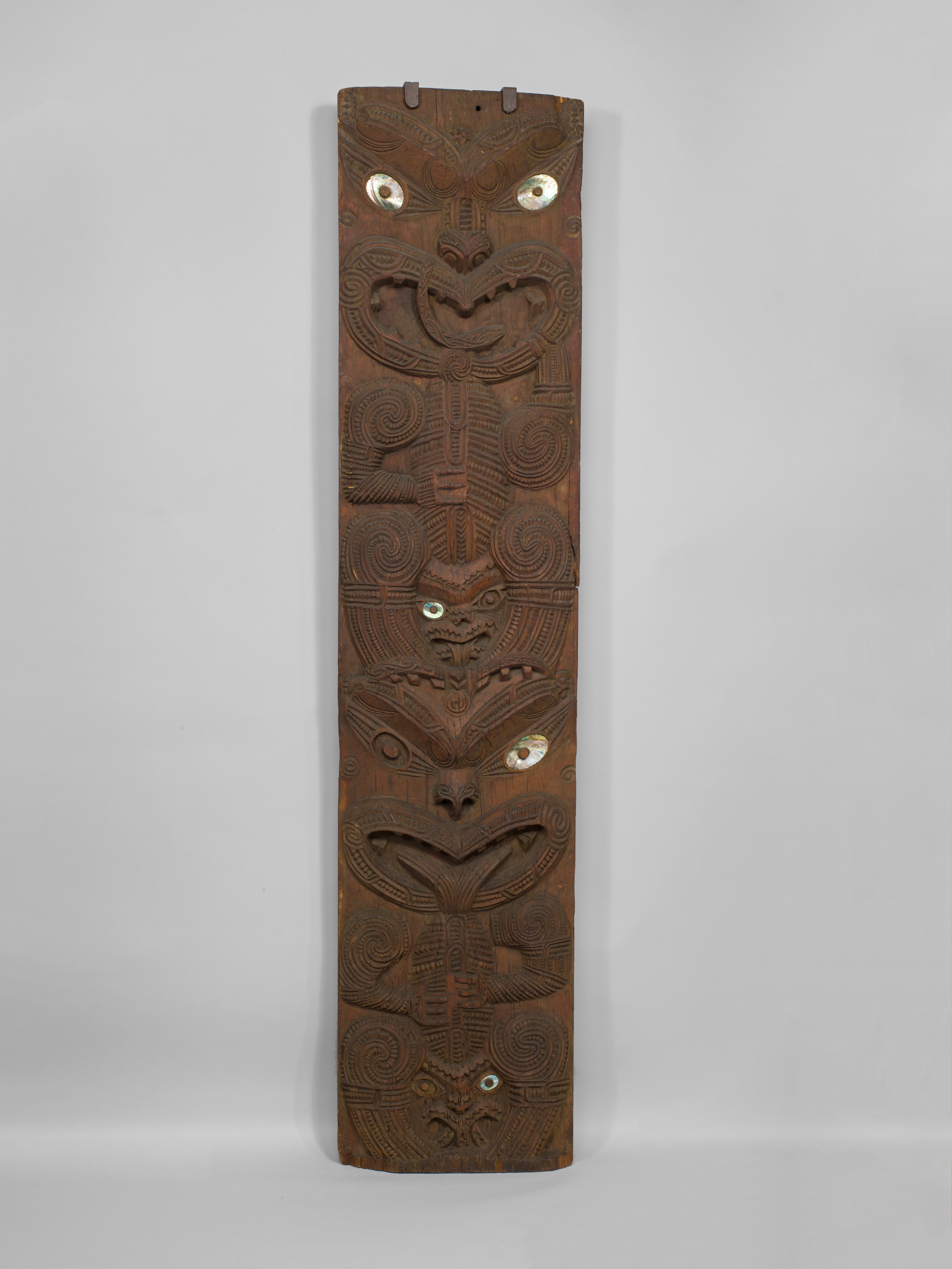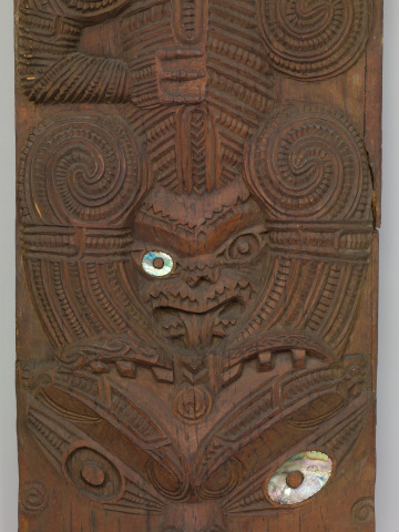 This "poupou," or carved panel, belongs to a group of 46 that were created to form the framework of a large Maori meeting house, which ultimately was never constructed. Supporting the rafters, this solid panel would alternate with lattice openwork panels. "Wharenui" (meeting houses) are considered to be the property of the local community and function as a space for important gatherings, such as weddings and "tangihanga," or death ceremonies.