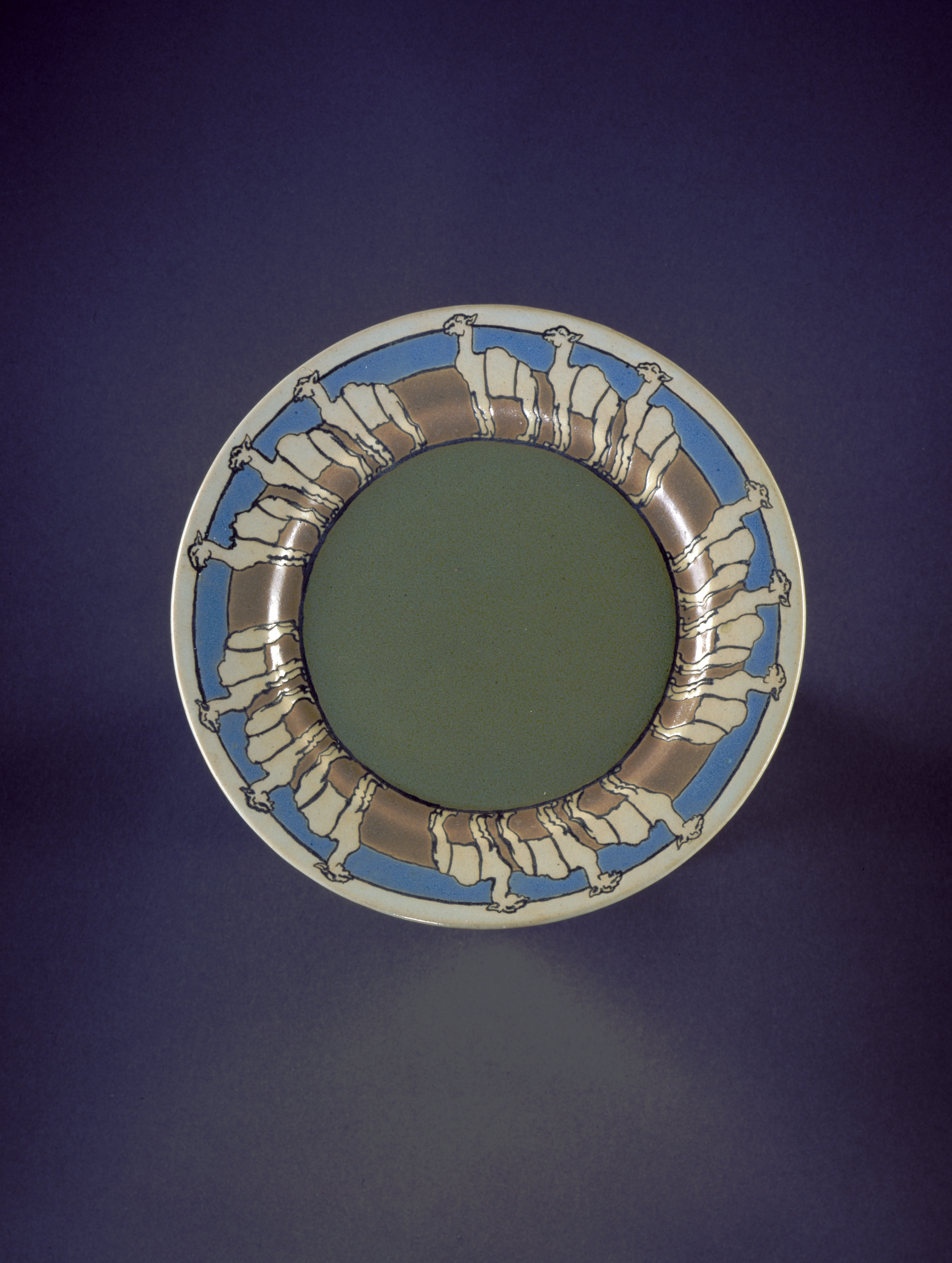 An incised design of camels and bands of colorful matte glazes encircle the rim of this small plate that was probably part of a child's breakfast set. The decorator, Sarah Gelner, worked for the Paul Revere Pottery in Boston, MA, which was established with support from a wealthy patron. The pottery employed more than two hundred young women who worked as decorators before it closed in 1942. (D. Conradsen 11/2004)