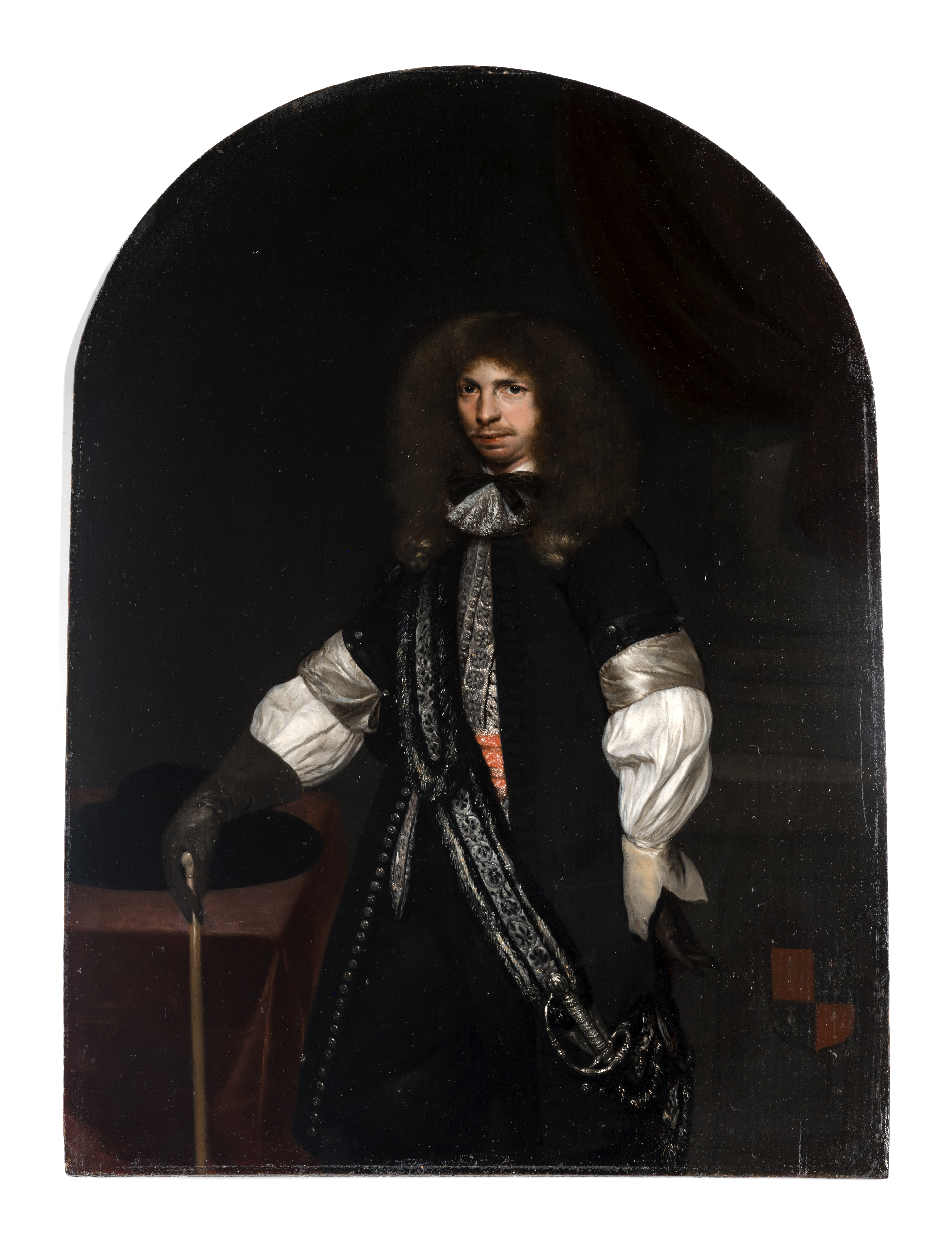 The elaborately decorated sword band, the embroidered shirt, and the finely-made satin lining of the cuffs show off the sitter’s wealth and taste. Few artists could match Gerard ter Borch’s facility in capturing the surface qualities of satin and lace, and he uses these talents to great effect in this beautiful portrait. While the sword band extends longer than Jacob de Graeff would have worn it in 17th-century Amsterdam, the family was extremely rich and may have encouraged the painter to emphasize their status in this way.