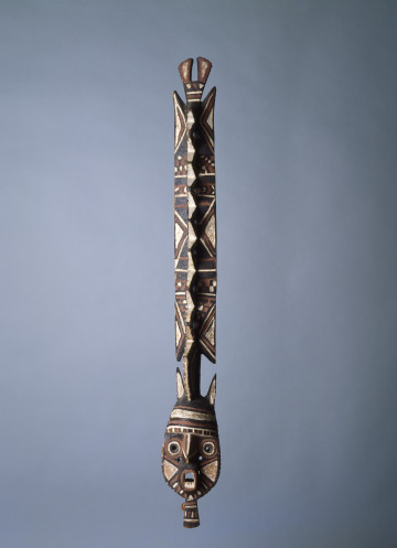 Masks from Burkina Faso are famous for their dramatic forms and graphic surface patterning, as seen in this example. Enhanced by vivid, contrasting pigments, this mask and the one to the left each feature a plank crest or superstructure that soars overhead. Rising high into the air, swirling, and bobbing when danced by a masquerader, these masks and their dramatic scale and movements would emphasize the otherworldliness of the spirits they represent. The abstract geometric designs of plank masks could suggest the presence of various, invented protective spirits that guard and guide communities and accompany the spirits of the dead into the ancestral realm.