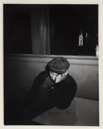 Arthur Fellig, nicknamed Weegee, was a freelance photojournalist in New York City who preferred working at night. In this photograph, a lone man attempts to sleep in uncomfortable circumstances: the hard bench and table of a bar. A burst of flash from Weegee’s camera pulls the figure out of the darkness around him. With a direct and unsentimental approach, he attempted to capture the range of nocturnal life, including quiet moments of isolated figures within the crowded city.