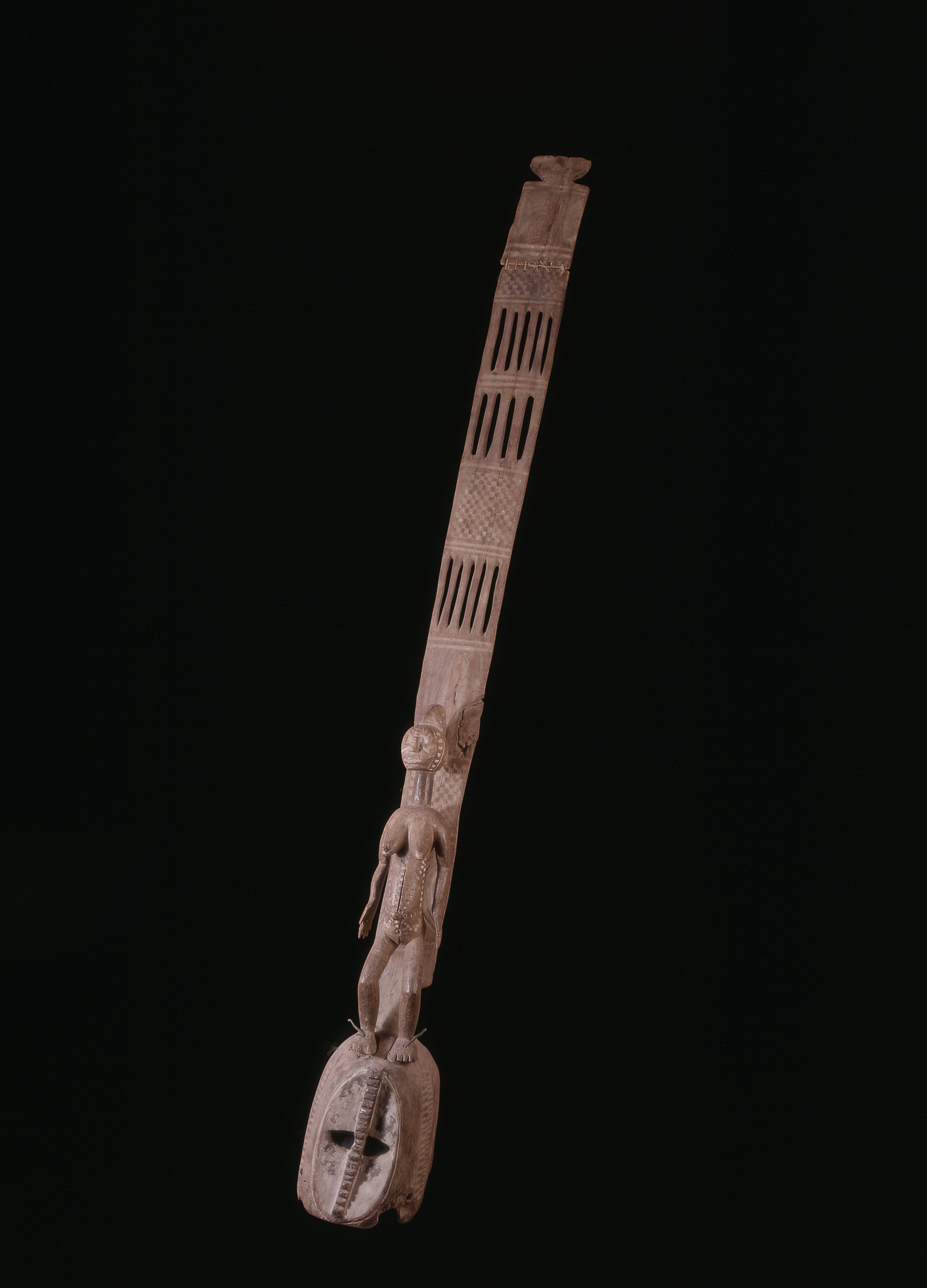 This mask combines a female figure, which was carved separately and then attached to the mask structure, with the abstract shaft typical of a Mossi mask that towers above the young men who wear it. Masks such as this are danced at funerals in highly acrobatic, dramatic performances designed to emphasize their sculptural height. Among the Mossi, widows who have raised their children and have returned to the households of their father’s family are known as wemba. They are honored as living ancestors and are believed to have a direct line to the spirits of the family forebears. When these women die, masks such as this one, known as "karan-wemba," (wemba mask) perform at their funerals to honor them.