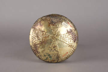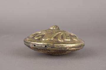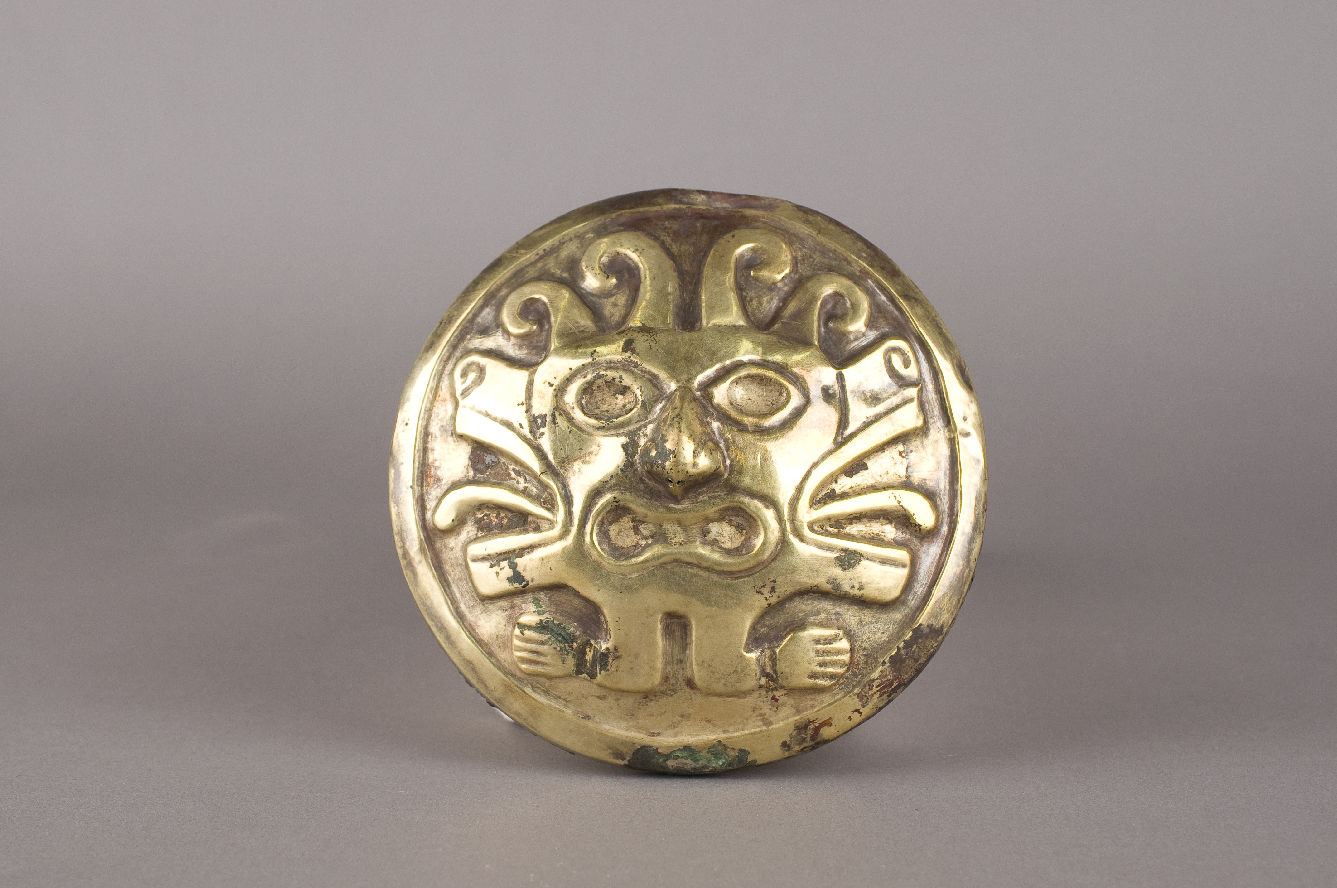 [1] An invoice dated May 5, 1967 from D'Arcy Galleries to Morton D. May documents this purchase, listed as "#2107 / Round pendant (rattle) showing a triple-faced feline deity, gold / from Vicus / Peru, very early Mochica (400-200 B.C.) / 5" in diameter" [May Archives, Saint Louis Art Museum].