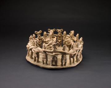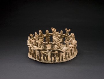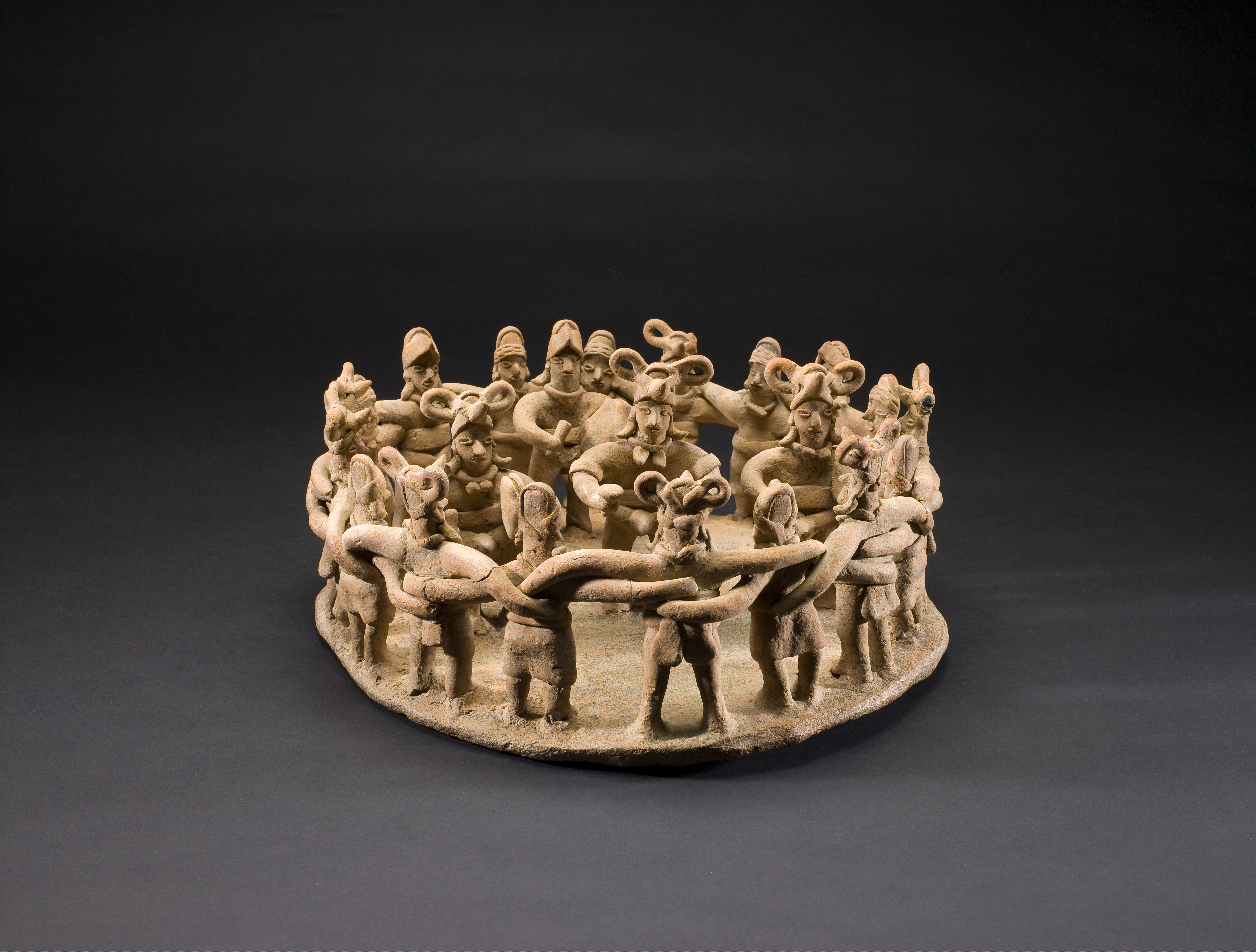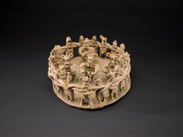 The elongated arms of 18 alternating men and women lock together to form a dance circle around four musicians holding drums and rattles. The female figures wear wrap skirts and simple banded headdresses, while the males’ attire consists of waistbands, ear ornaments, and elaborate headdresses. Detailed models such as this one provide unique insight into the costume and ritual performances of ancient West Mexico. Music and dance were central to the region’s festivals held to honor and praise ancestors, appease natural forces, and celebrate victories, marriages, and other significant events.