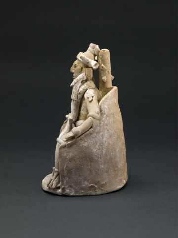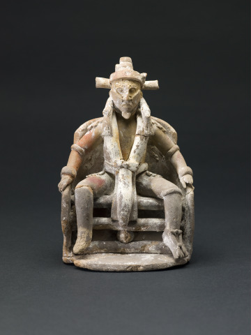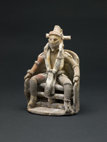 Classic Maya images of captives are often ambiguous. The regal posture of this figurine contradicts other details, such as the ligatures or straps on the arms and legs, and the general construction of his throne-like litter. These details suggest that this captive is a noble bound to a scaffold with a tree-like shaft placed behind him. Rulers and royalty of conquered cities were often stripped of their courtly trappings. This work reflects the challenge of depicting a regal prisoner without his regalia. Here, long strips of cloth threaded through the ears replace fine greenstone earplugs. The rope-like yoke draped across the chest falls between the legs in a gesture that highlights the humiliation of naked exposure that typically preceded sacrifice.