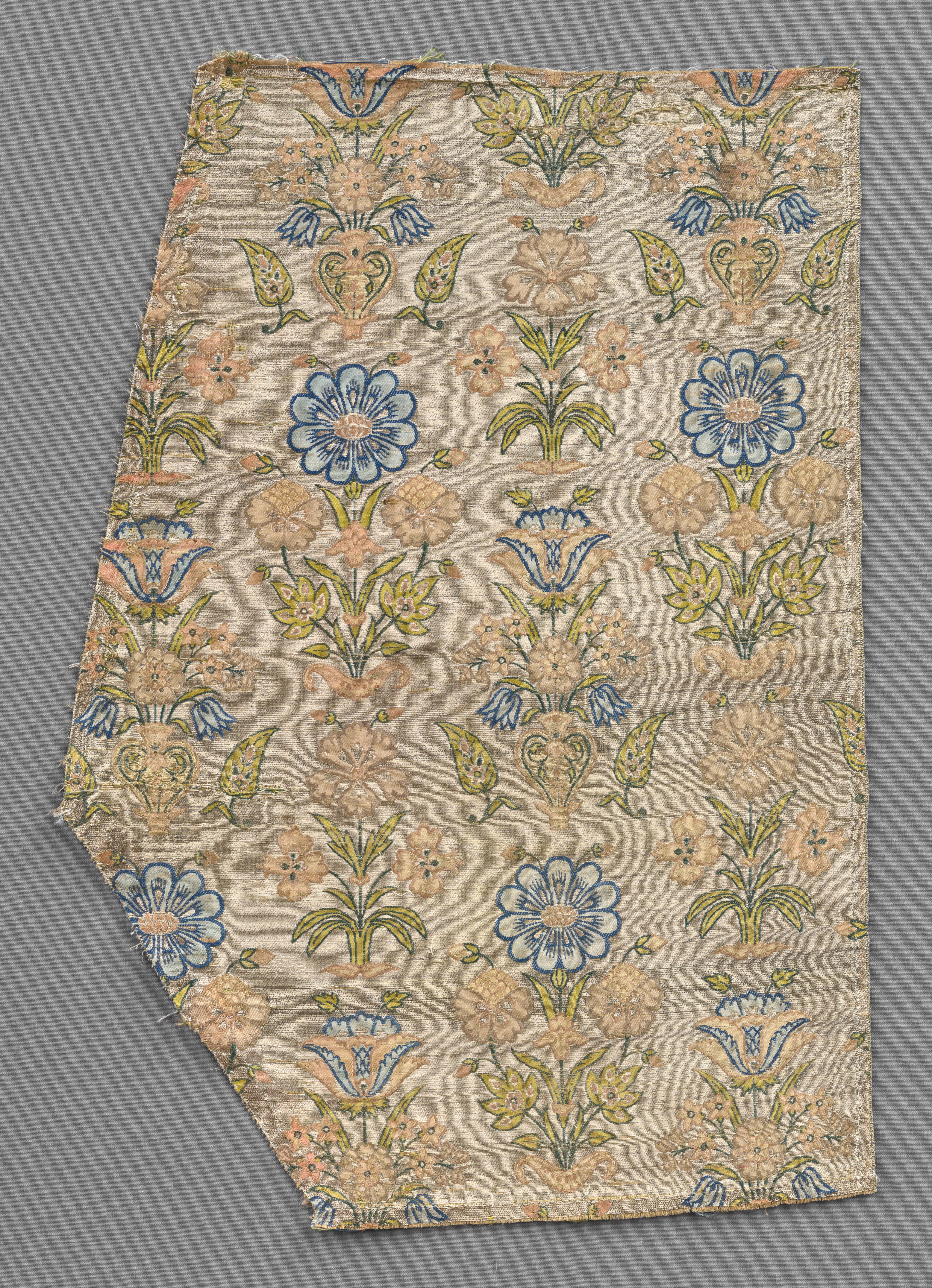 This fragmentary textile has a beige-gold background with three blue and salmon floral patterns arranged vertically. Some of the floral sprays emerge from the ground. Others appear from a low container or from a vase with open, full-faced, profile, and drooping flowers. The leaves are uniformly yellow-green and outlined with dark green.