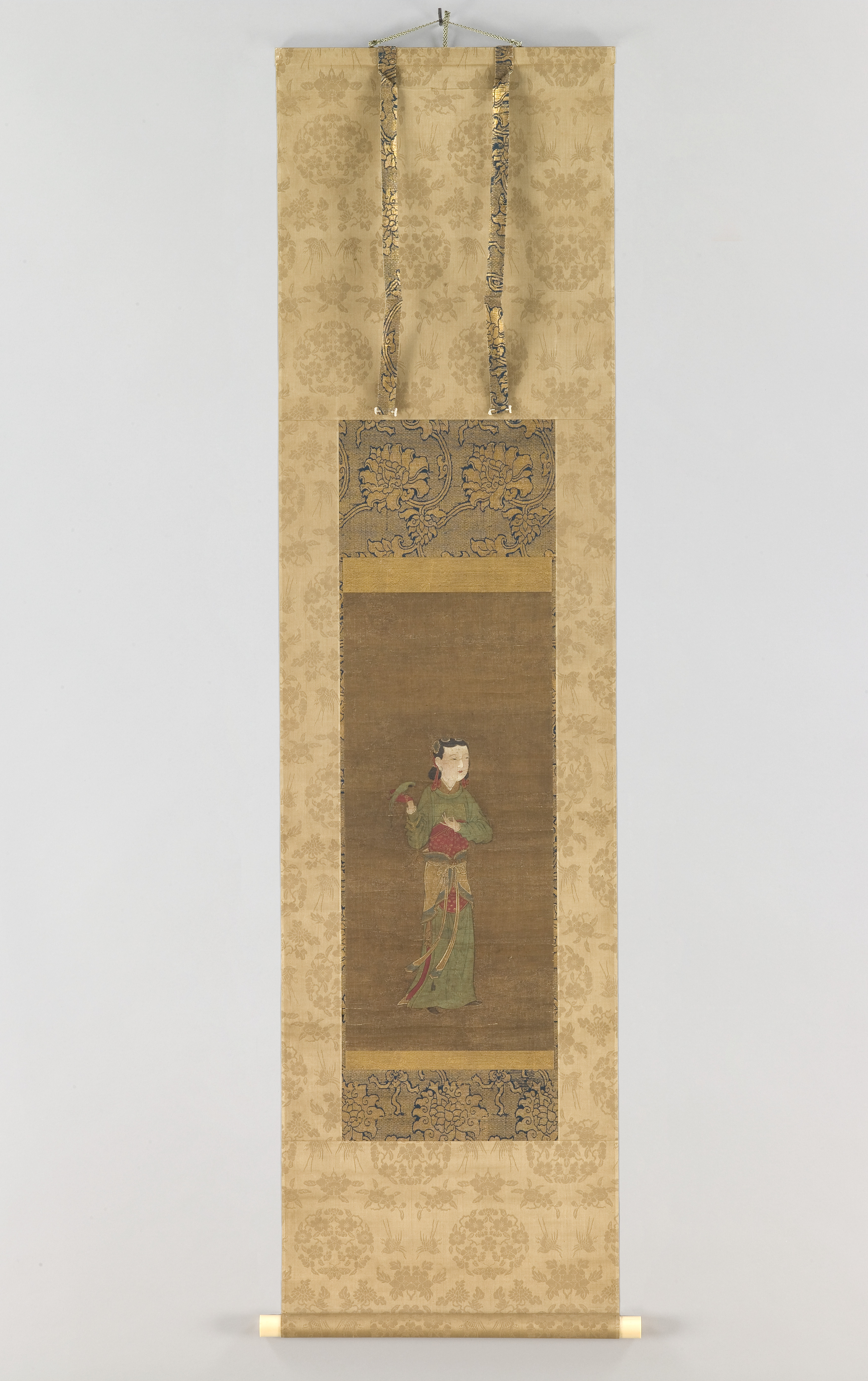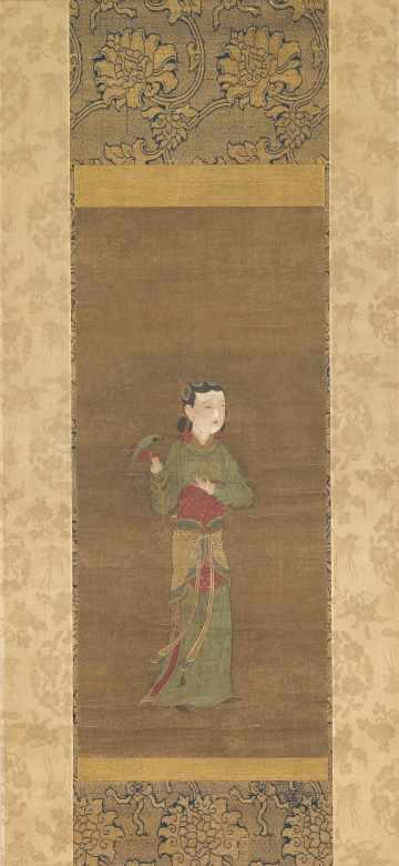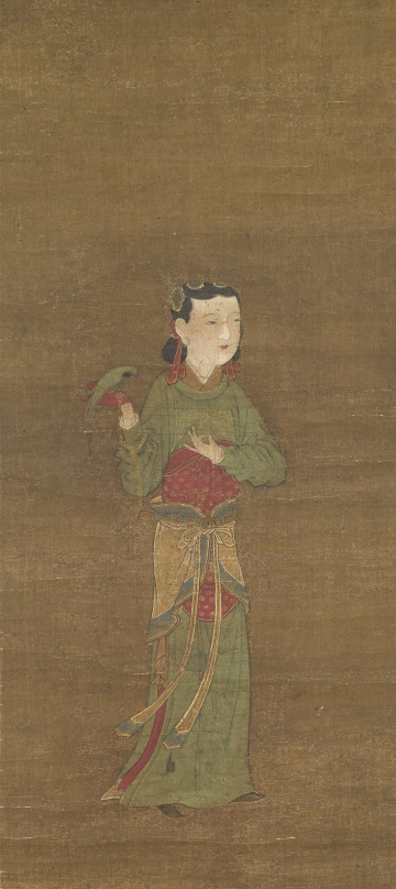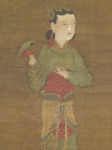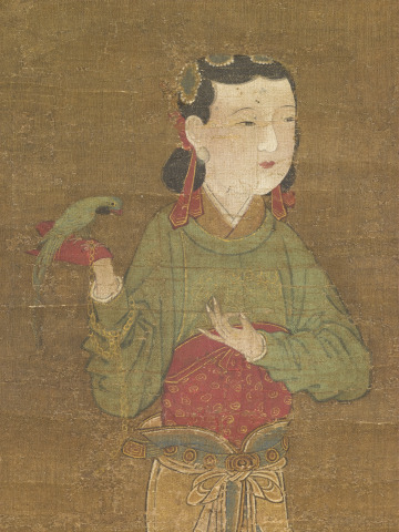 This painting depicts the standing figure of a court lady with a green parrot perched on the palm of her gloved hand. The bird is tied to a chain, one end of which goes around the woman’s forearm. This way of holding a bird goes back to the Tang dynasty (618–907), when such birds were brought from the tropics and Southeast Asia as exotic gifts or tribute items and often became prized pets of women at court.