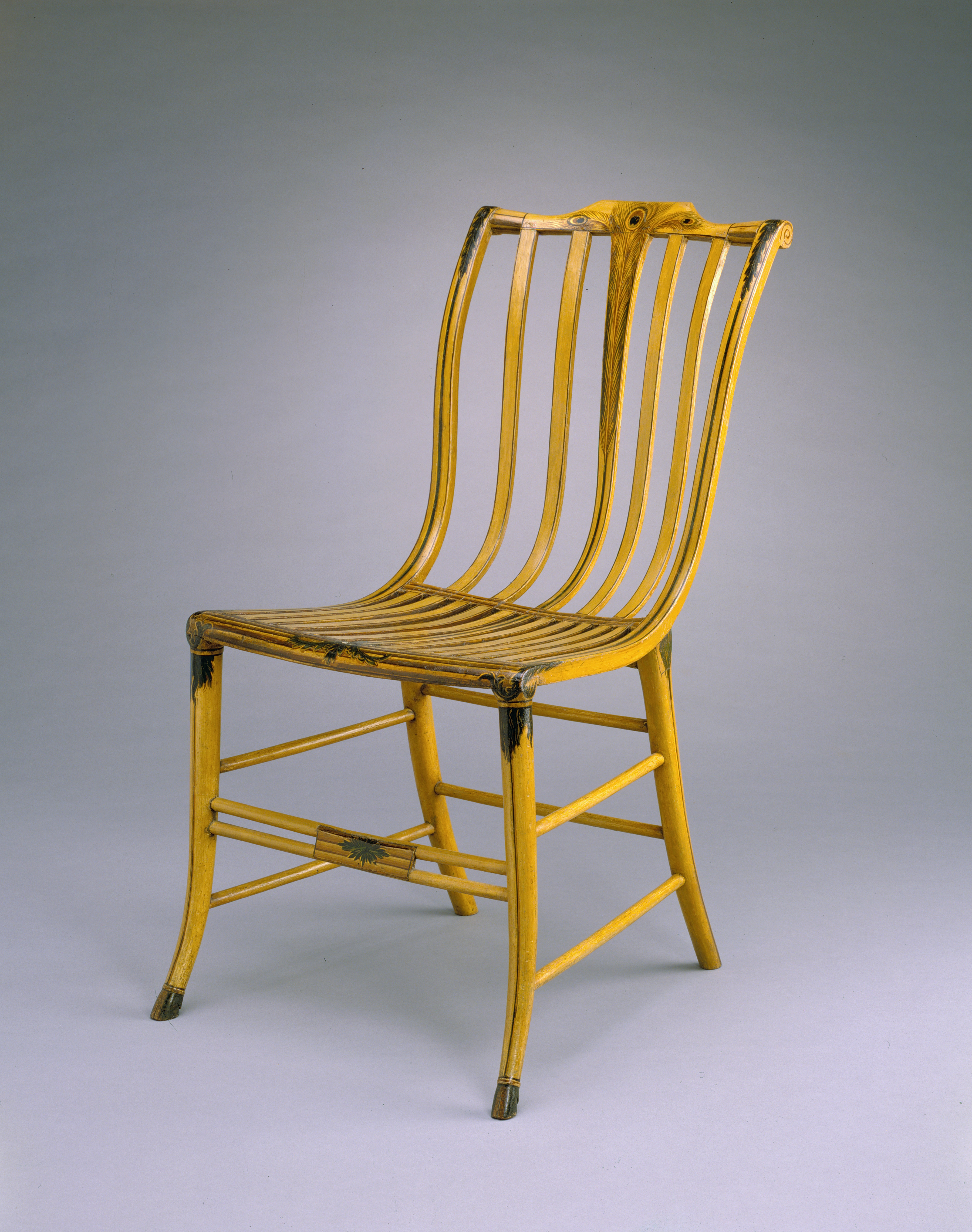 The son of a wheelwright, Samuel Gragg patented several techniques for making chairs with bentwood. Gragg’s technique used long strips of oak to form the curved back supports and the concave seat. These parts were made using steam and molds to bend the wood into exaggerated curves. According to Gragg’s patent application, the design rendered his chair “very elastic, very comfortable and agreeable to the person sitting in it.” Decoration such as the painted and gilded peacock feather on the back, and front feet painted like hooves helped this innovative design conform to the taste for classical-style furniture.