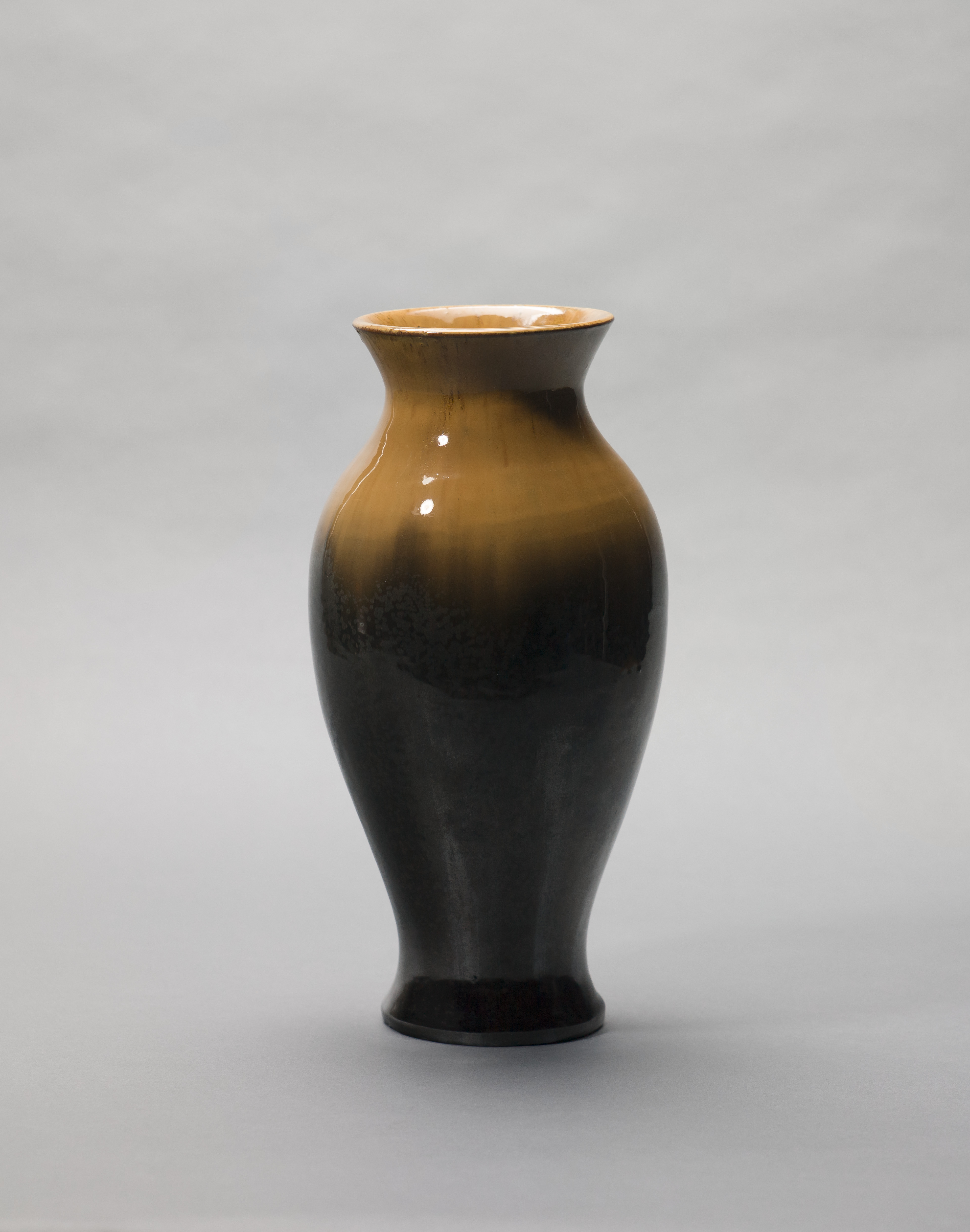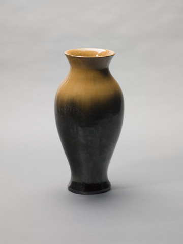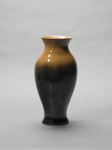 Fulper pottery was made using high-fire glazes and stoneware clay that was also used for utilitarian wares the company produced. The streaked orange glaze around the shoulder and neck of this Asian-style vase contrasts with the lustered charcoal gray glaze at the base that is dappled with crystals. These glazes, called flambé and mirror black, are typical of the varied glaze effects that were often combined in a single piece of Fulper pottery. William Fulper adopted these and other evocative names for colors and glazes that evoked Asian and Islamic precedents.