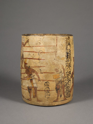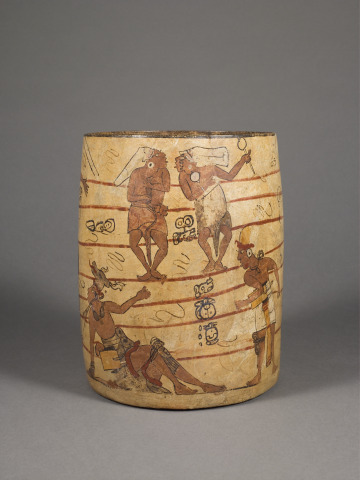The large black circle and horizontal red stripes on this cylindrical vessel represent a hard rubber ball bouncing down the steps of a Maya ball court. The ballplayers gape at the ball while various spectators gesture towards it, avidly watch, gossip, or play instruments in the stands. This sense of dynamic spectacle is unusual in representations of the ballgame. The ballgame story on this vessel unfolds in sections as the viewer examines the scene, guided by the diagonal placement of the figures. The hieroglyphs seen throughout are loosely rendered, as though the scribe emulated the speed of the game.