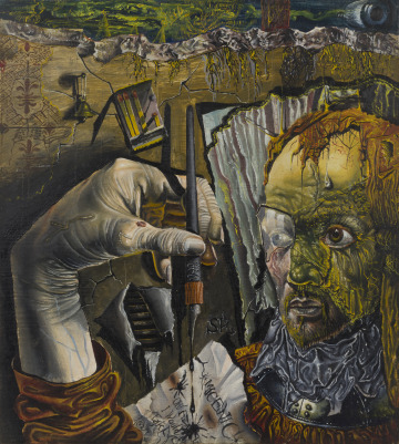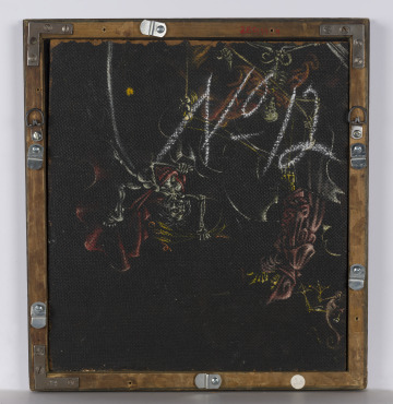 The intimate size and provocative elements of this painting draw us close to examine the world within its frame. An open matchbook and tiny bell hang from a crumbling wall. An ink pen drips from the contorted hand of a man whose flesh mutates to a glowing green. Though inexplicable, all is typical in the small, compacted compositions of Siegfried Reinhardt.