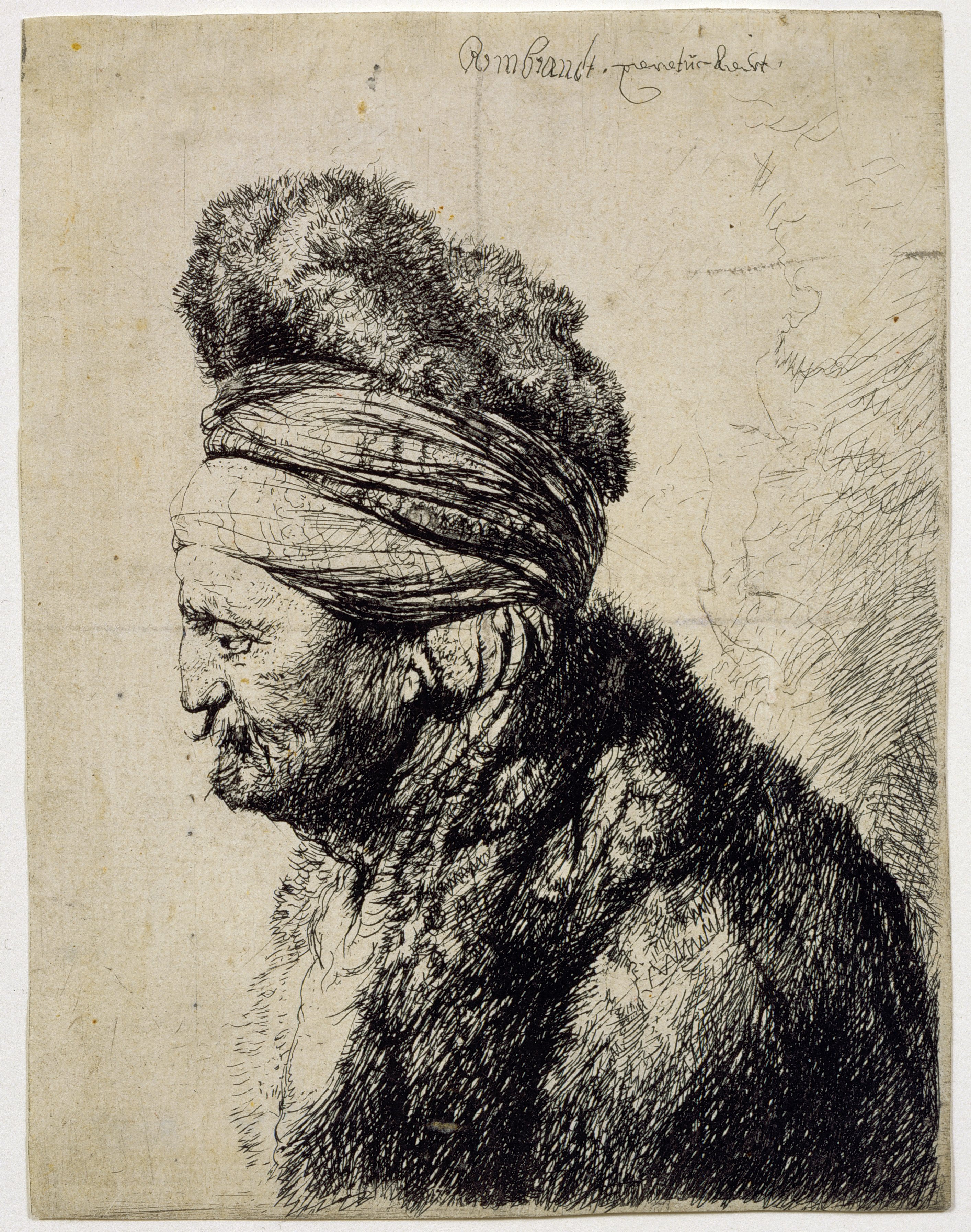 This man with a dramatic profile was one Rembrandt van Rijn's favorite studio models. His wonderful fur hat makes him appear like a sultan or a visitor from afar. The Dutch would have considered this image a "tronie," a term used for studies of expression, physiognomy, or any kind of interesting personality. Such figures often wore garments that looked costly, foreign, "antique,' or simply curious, allowing artists like Rembrandt an opportunity to show off their mastery of depicting fur, cashmere, and other fabrics.