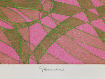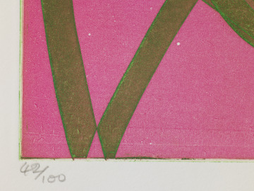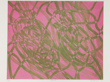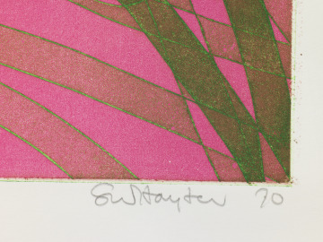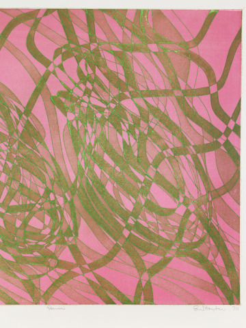 Throughout this image, thin green lines appear in pairs and create wider serpentine bands that intersect and overlap. To achieve the paired contours, Stanley William Hayter developed an experimental method: He used a plastic tape on the plate to assist cutting into the surface. Hayter thought deeply about the possibilities for line in intaglio printing—a type of printmaking where incisions are made into a plate to hold ink. This work is a striking example. A pioneering printmaker, Hayter demonstrated the medium’s capacity for abstraction to countless artists in Europe and the United States during the mid-20th century.