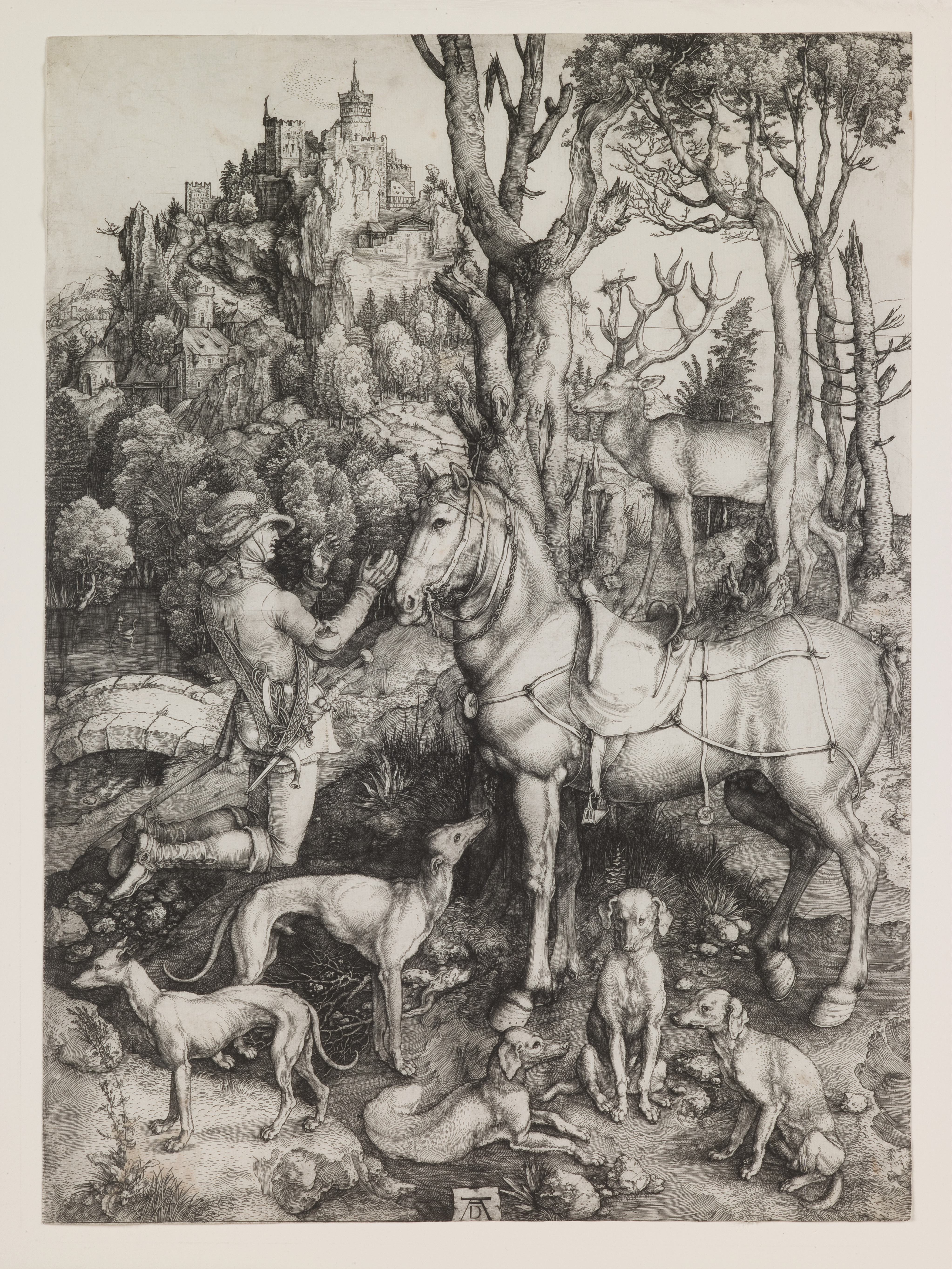 Albrecht Dürer depicted the miraculous moment when the ancient Roman general Placidus converted to Christianity within a lush and carefully observed northern forest. The composition is dominated by the general’s majestic horse and five hunting dogs poised among scrupulously delineated grasses, roots, plants, and rocks. The action, however, occurs between the kneeling general and the immobilized stag standing at right. Placidus converted when the brilliantly illuminated Crucifixion appeared between the deer’s antlers and Jesus spoke to him through the deer. Thereafter, Placidus took the name Eustace. In the 19th century, German artists adopted Dürer as a central figure in German artistic tradition, a key part of the construction of a national identity.