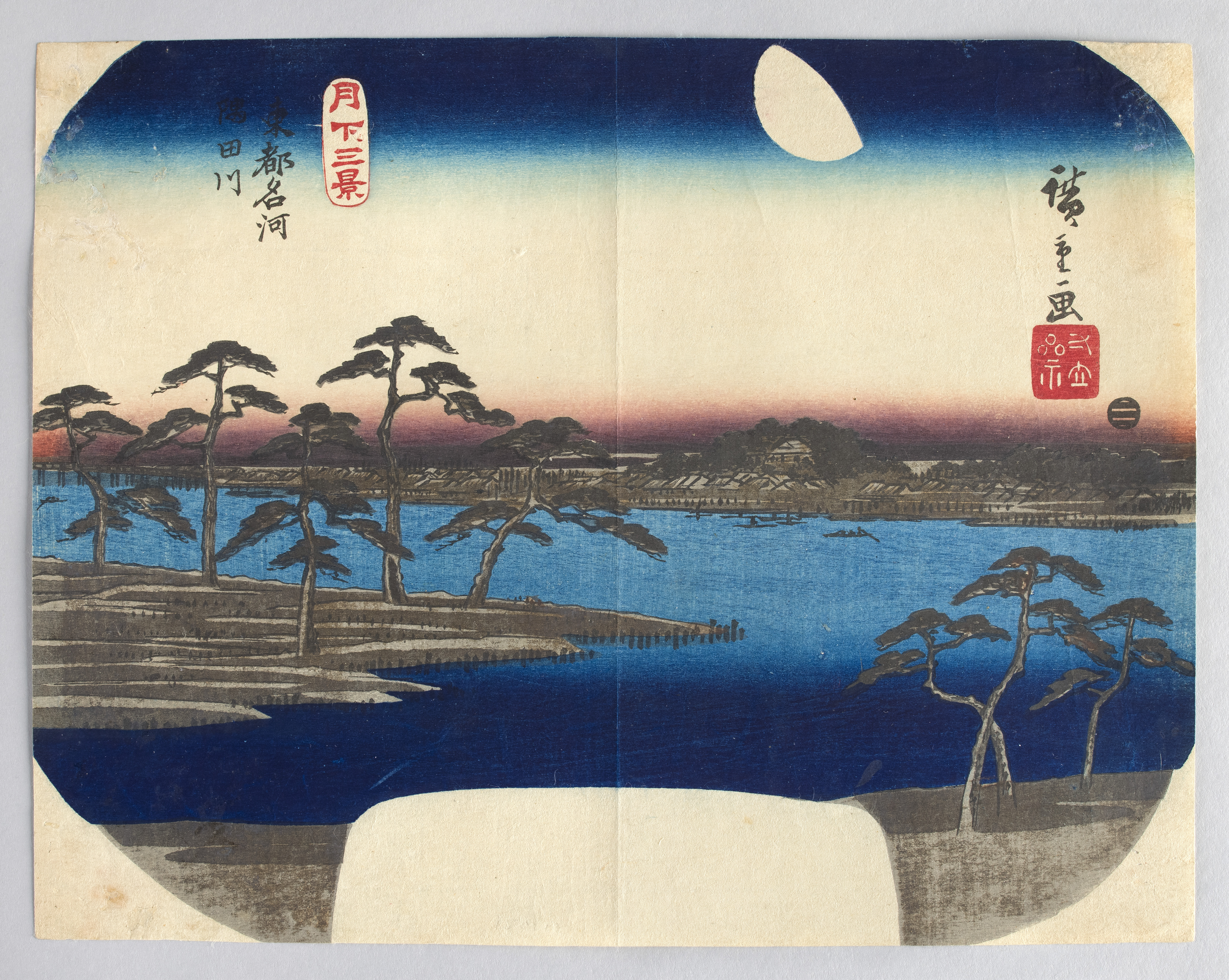 This unmounted fan print (uchiwa-e) depicts a view of the Sumida River, the most important waterway traversing the city of Edo. Edo was known as the eastern capital of Japan to distinguish it from Kyōto, the imperial capital located further west. Along the river, tall pine trees line the foreground embankments, while low wooden buildings appear on the opposite shore. By virtue of their materials and function, fan prints are rare. They were mounted on handheld bamboo fans that easily wore out and were discarded when damaged beyond repair. This fan print, one of three designs from the series Three Moonlit Views (Gekka sankei), is extremely scarce; no other impression is known to have survived in any collection within Japan or internationally.