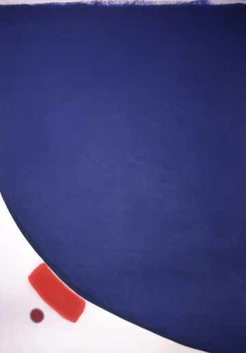 In this asymmetrical composition, an expanse of cobalt blue is balanced by a small red curve and purple dot. Jules Olitski modeled this arrangement after the shape of a woman’s breast. Olitski applied thinned acrylic paint onto a large unprimed canvas; this staining technique resulted in soft-edged shapes. Influential art critic Clement Greenberg admired Olitski’s work for its openness and flat planes of color, referring to him in 1987 as “the best painter alive.”