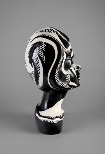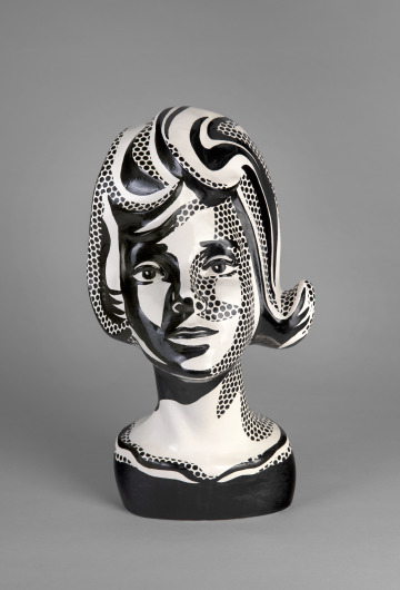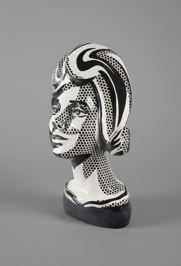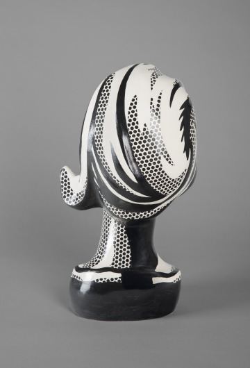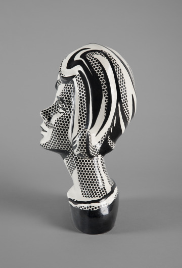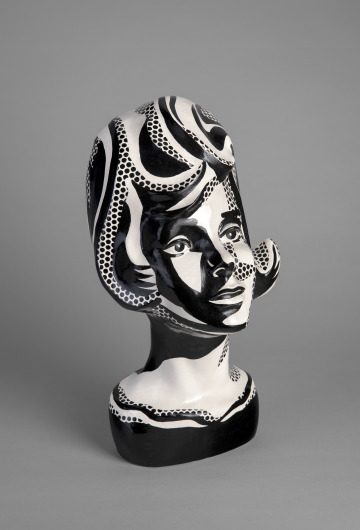 Alternating areas of black and white interspersed with dot patterns create the appearance of shadow and light on a woman’s head and stiffly set hairdo. This ceramic reflects Roy Lichtenstein’s fascination with comics, where he found similar images of carefully coiffed and fashionable young women. The dots on the woman’s face recall the Ben Day printing process, which Lichtenstein imitated and manipulated in his paintings and sculptures—a style for which he became best known. In this work, Lichtenstein applied his design with the collaborative help of the potter and ceramist Ka Kwong Hui.