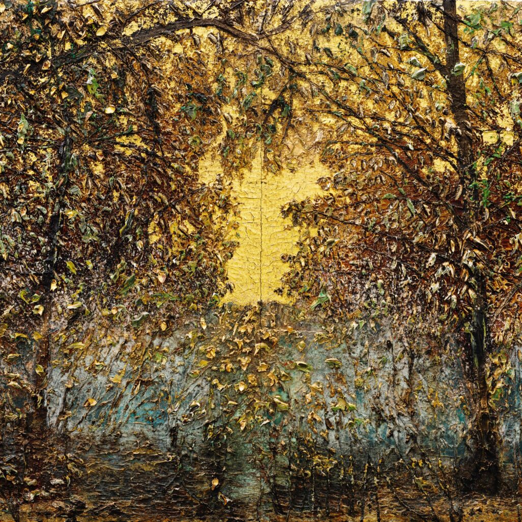 Anselm Kiefer, German, born 1945; Der Rhein (The Rhine), 2023; emulsion, oil, acrylic, shellac, gold leaf, and sediment of electrolysis on canvas; 110 1/4 inches x 12 feet 5 5/8 inches; Collection of the artist and courtesy Gagosian 2025.317; © Anselm Kiefer, Photo: Nina Slavcheva