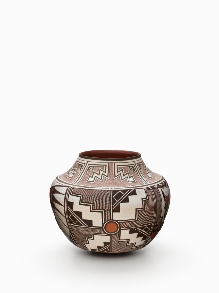 Timothy Edaakie, Zuni, 1974–2020; Jaycee Nahohai, Zuni; and Anderson Peynesta, Zuni; Nahohai Tribute Pot, 2016; clay and paint; 12 1/3 x 14 15/16 inches; School for Advanced Research, New Mexico, Gift of the artists, in memory of Randy Nahoahi, 2017; © Estate of Timothy Edaakie; © Jaycee Nahohai; © Anderson Peynesta
