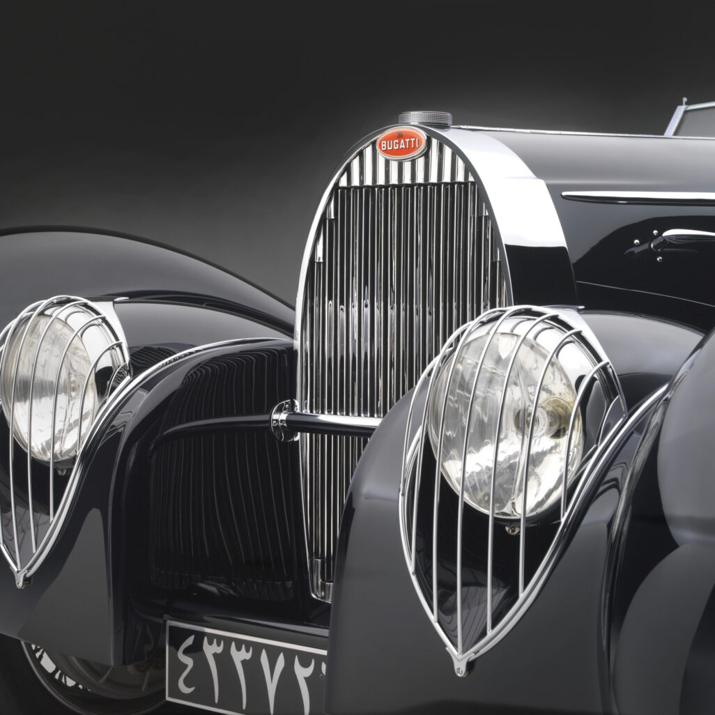 Designed by Carrosserie Vanvooren, Courbevoie, France, active 1888–1950; made by Automobiles Ettore Bugatti, Molsheim, France, active 1909–1963; Type 57C Shah (detail), 1939; 51 inches x 78 inches x 16 feet 1 inches; Collection of Petersen Automotive Museum 2025.01; Photo: Peter Harholdt