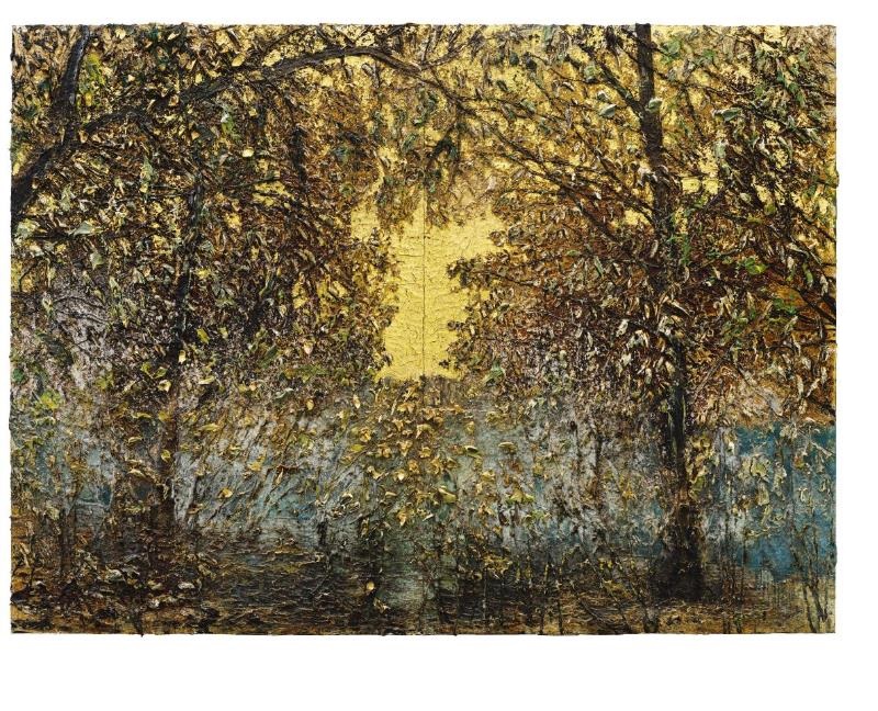 Anselm Kiefer, German, born 1945; Der Rhein (The Rhine), 2024; emulsion, oil, acrylic, shellac, gold leaf, and sediment of electrolysis on canvas; 110 1/4 inches x 12 feet 5 5/8 inches; Private collection 2025.317; © Anselm Kiefer, Photo: Nina Slavcheva
