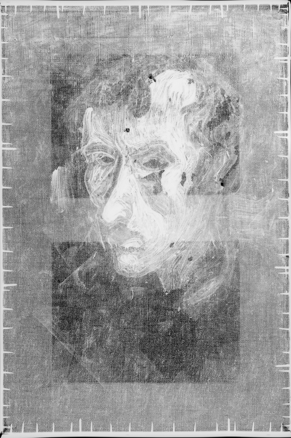The X-radiograph dramatically reveals that a portrait of a man is painted below the bar scene of card players. The portrait was painted with pigments that contain heavy metals that absorb X-rays and appear white in the image—capturing the underlying composition. Compared to the style of Grosz’s final painting, the brushstrokes of the portrait are loose and gestural. The identity of the man remains a mystery.