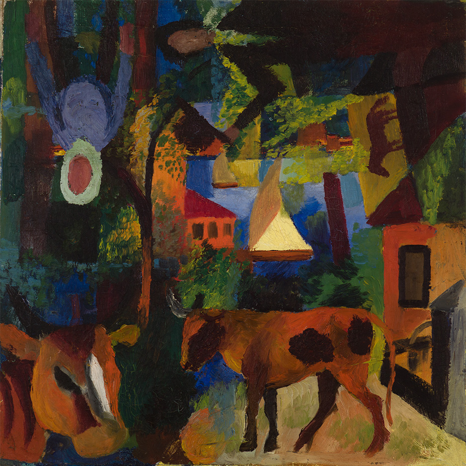 August Macke, German, 1887–1914; Landscape with Cows, Sailboat, and Painted-in Figures, 1914; oil on canvas; 20 1/4 x 20 1/4 inches; Saint Louis Art Museum, Bequest of Morton D. May 911:1983