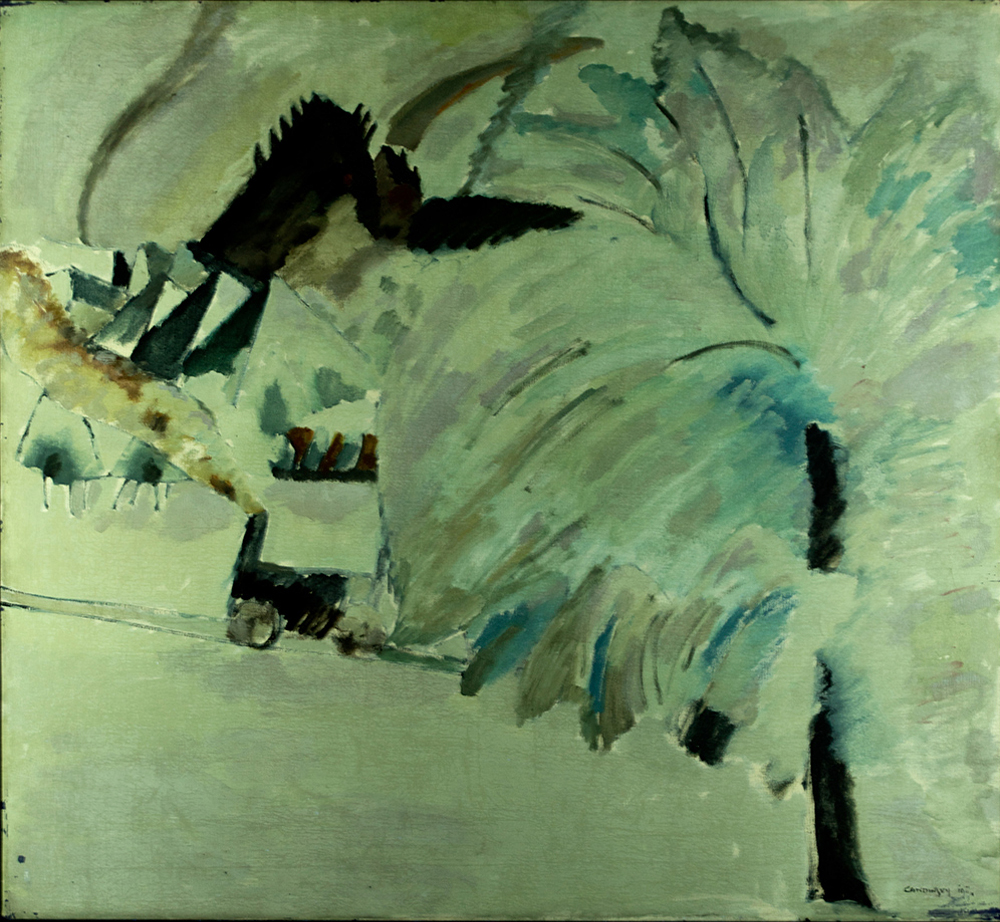 Raking light reinforces how thinly Kandinsky painted Murnau with Locomotive. Apart from a few instances of thicker paint impasto articulating the locomotive’s steam and crests of tree branches, the weave of the canvas is visible through the thin paint layers.
