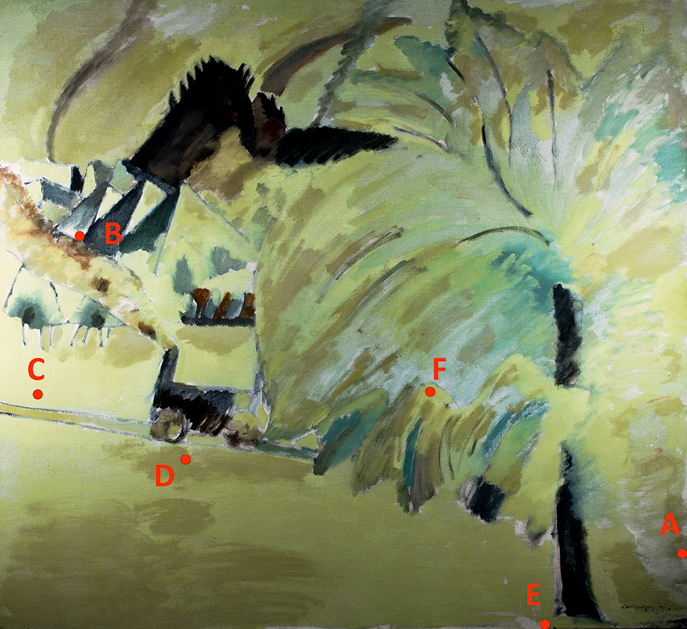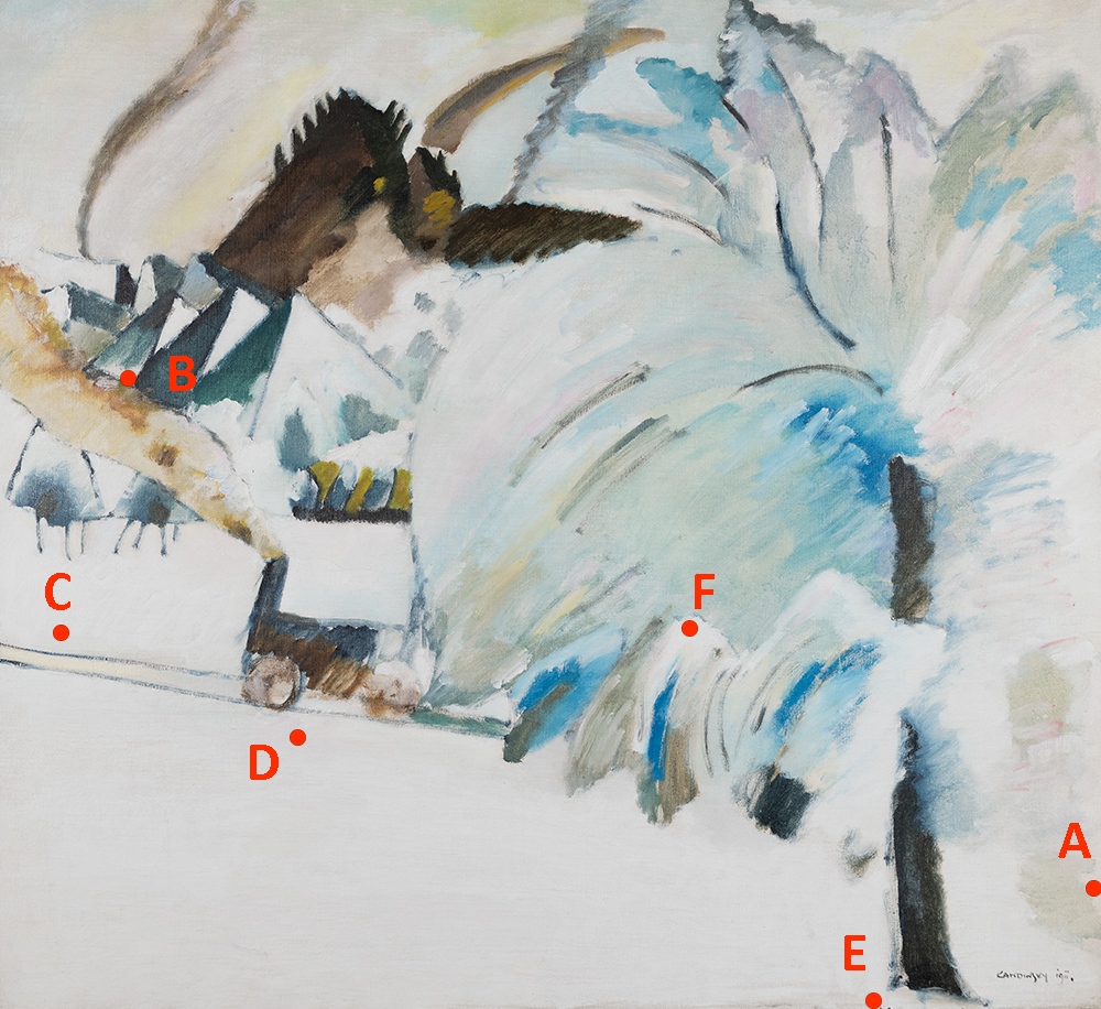 Points C, F: Kandinsky applied his design layers and more colorful forms brushed on using browns, blacks, blues, purples, and yellows. In the uppermost paint layers, he applied the snowy whites using zinc white as a base, and pulled in different oils/waxes and pigments on his palette. Under UV, these zinc-based whites glow acidic yellow.