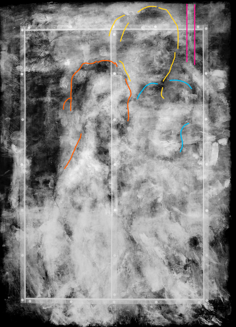 Kokoschka morphed his compositions gradually into their final states by adding more and more paint layers. His process produces a fascinating tumble of figures in the X-radiograph.