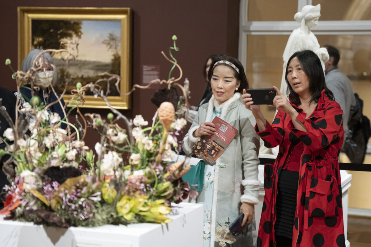 Visitors photograph a floral recreation by Kira Mulvany, Cynthia Ryan, and Carly Bohmer from Roses & Mint Florals at Art in Bloom in 2023.