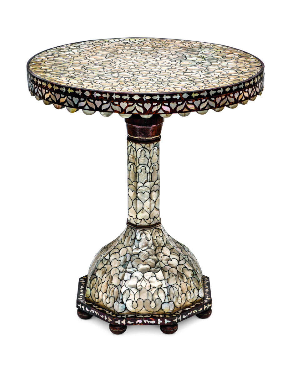 Unidentified artist, Guatemala (for export market, possibly Peru); “Side Table” (“Mesilla”), last third of the 18th century; wood, inlaid with mother-of-pearl, tortoiseshell, and silver; height: 29 1/8 inches, diameter: 25 9/16 inches; Los Angeles County Museum of Art, Purchased with funds provided by the Bernard and Edith Lewin Collection of Mexican Art Deaccession Fund M.2019.264.2a-b; photo © Museum Associates/LACMA