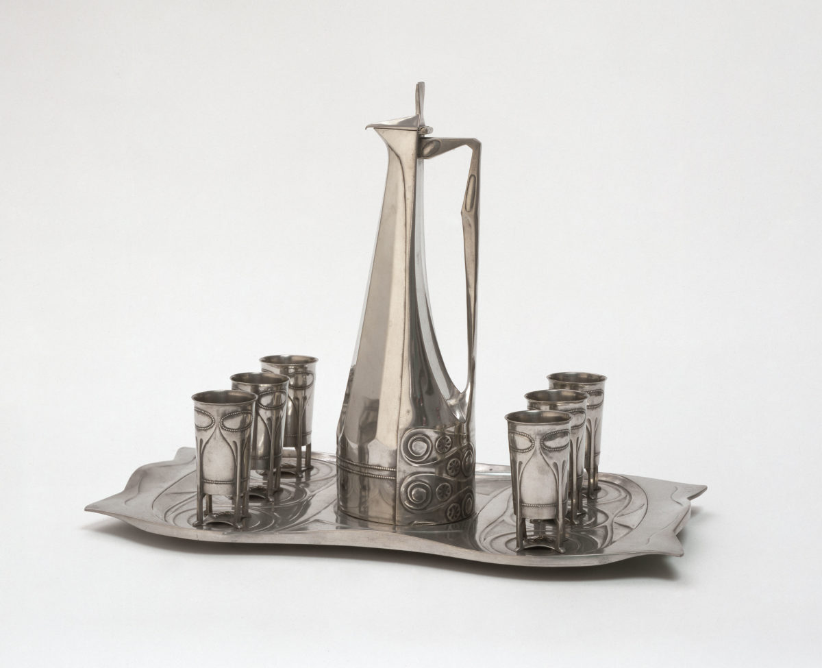 Joseph Maria Olbrich, Austrian, 1867–1908; Eduard Hueck Metallwarenfabrik, Lüdenscheid, Germany, founded 1864; “Wine Service”, c.1901; pewter; Overall (assembled): 13 1/2 x 18 x 10 3/8 inches; Saint Louis Art Museum, Museum Shop Fund and funds given by Mr. and Mrs. Sam Langsdorf Jr. and Mrs. John W. Calhoun 57:1995a-h