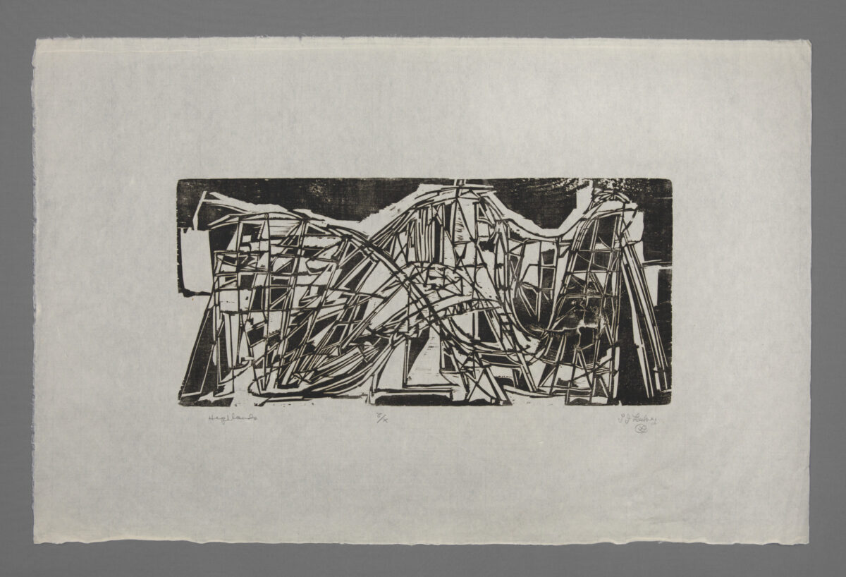 Leslie J. Laskey, American, 1921–2021; Highlands, mid-1960s; woodcut; image: 11 1/2 x 24 3/4 inches, sheet: 25 1/2 x 38 3/4 inches; Saint Louis Art Museum, Gift of Yvette Drury Dubinsky and John Paul Dubinsky, Bill and Gina Wischmeyer, Dennis Cope, and Frank Schwaiger, in honor of Leslie J. Laskey's 100th birthday 47:2021; © Estate of Leslie J. Laskey