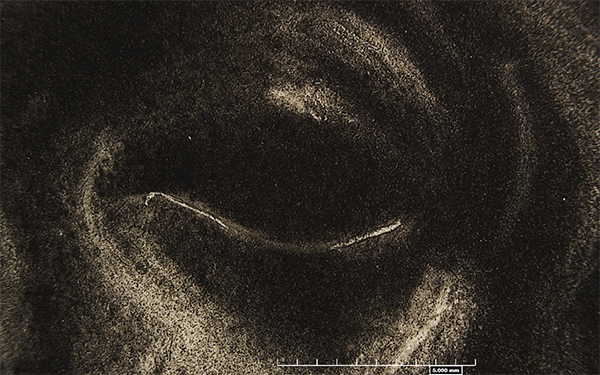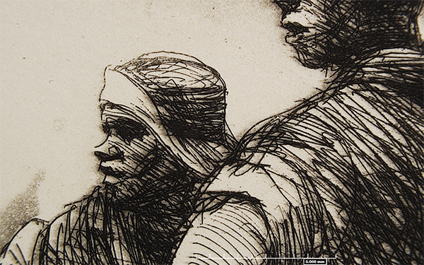 The range of visual effects that can be achieved using etching is virtually limitless. Variables include the type of ground (hard or soft); the strength of the acid and the length of time the plate is exposed to it; and the type of mark made on the plate—linear or tonal. When areas of the bare plate are exposed to acid, this is known as “open bite.” When inked, such areas will produce a light tone surrounded by a darker outline.