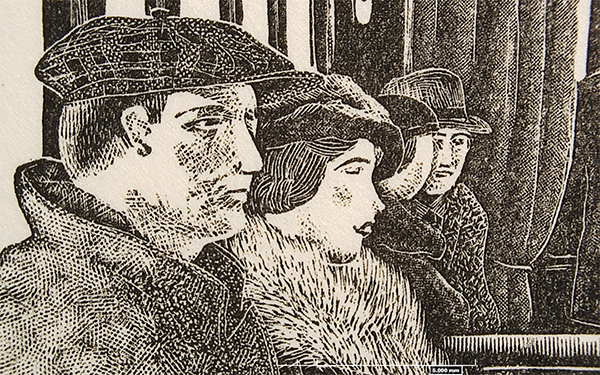 The oldest relief process. There are different approaches to designing, carving, and printing woodcuts. In the European tradition, a design is drawn on a block of wood and all non-printing areas are carved away using a gouge or a chisel. The image is usually printed with a press. The Japanese tradition of woodblock printing is similar in principle, but is characterized by hand-printing and the division of labor into clearly defined roles: an artist who designs the image, a carver who transfers the artist’s design and cuts the blocks—usually one for each color—and a master printer who ensures throughout that all blocks are properly aligned and registered. In contemporary printmaking, artists draw from both traditions.