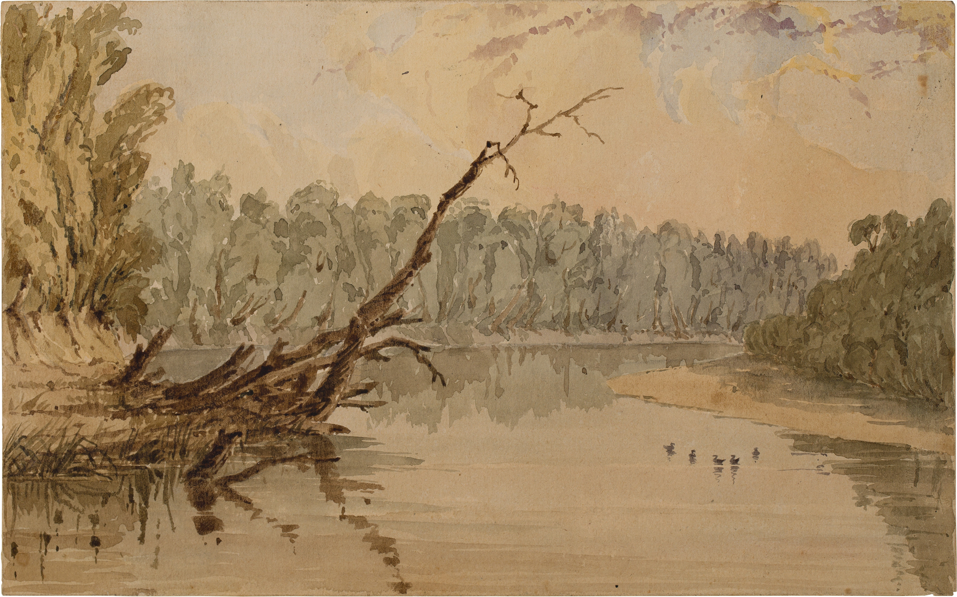 In 1846 Seth Eastman painted a series of watercolors as he traveled down the Mississippi River. He departed from Fort Snelling in Minnesota at the confluence of the Minnesota and Mississippi Rivers, stopped in Missouri at Jefferson Barracks, and ended at the confluence of the Ohio and Mississippi Rivers in Cairo, Illinois. During his journey Eastman, a military captain who had been trained as a topographic artist at West Point, captured specifics of the changing riverways, using delicate washes to illustrate reflections of trees, shrubbery, and waterfowl. For a time in the 1840s, Eastman’s illustrations of the river were on display at Fort Snelling, where visitors could view them on steamboat excursions up the Mississippi River from St. Louis. In total, Eastman painted more than 80 watercolors in the late 1840s, depicting the landscape and life of the Mississippi River valley, which was rapidly changing as colonial settlers moved West and forced Native peoples off their lands.